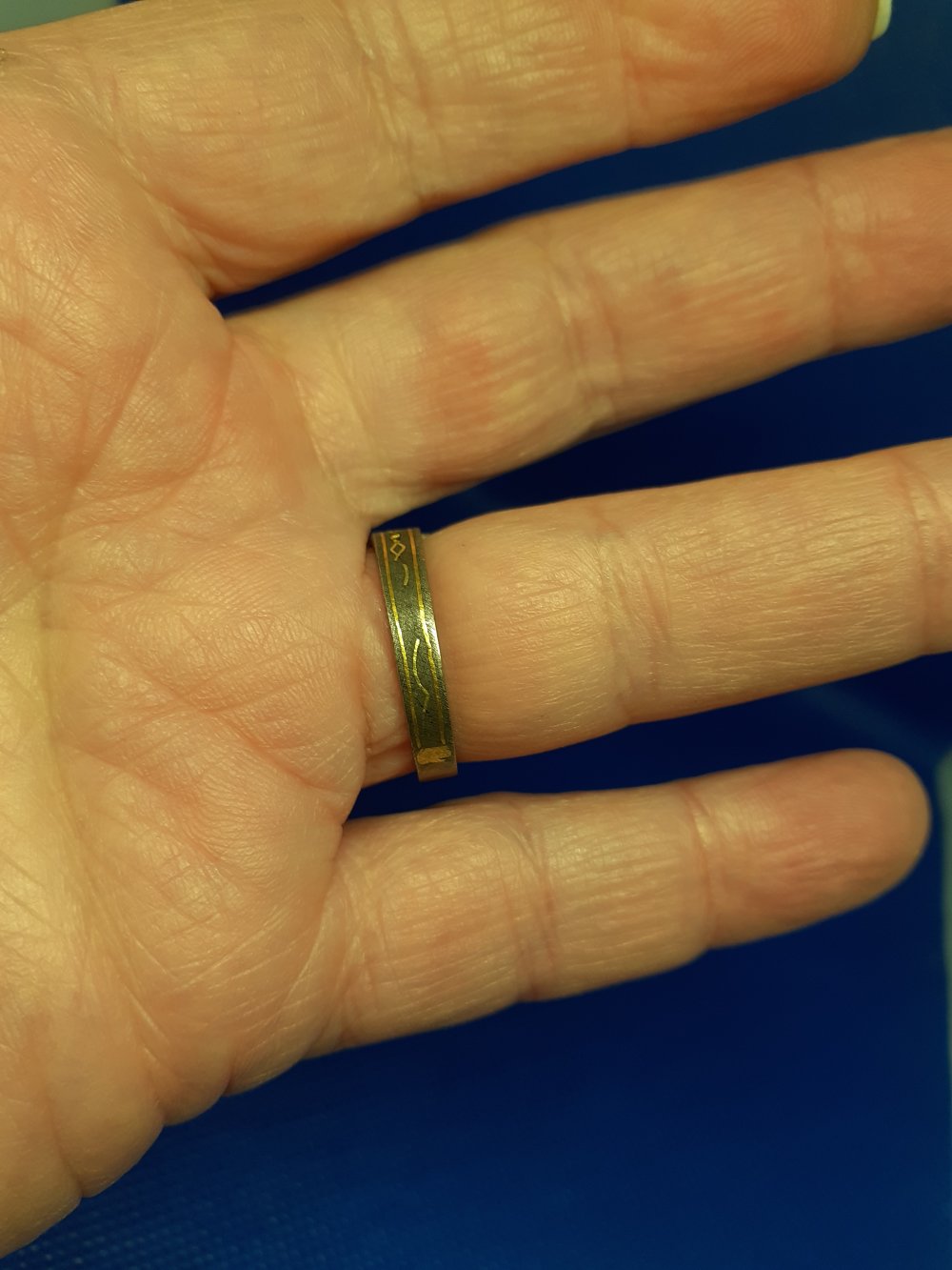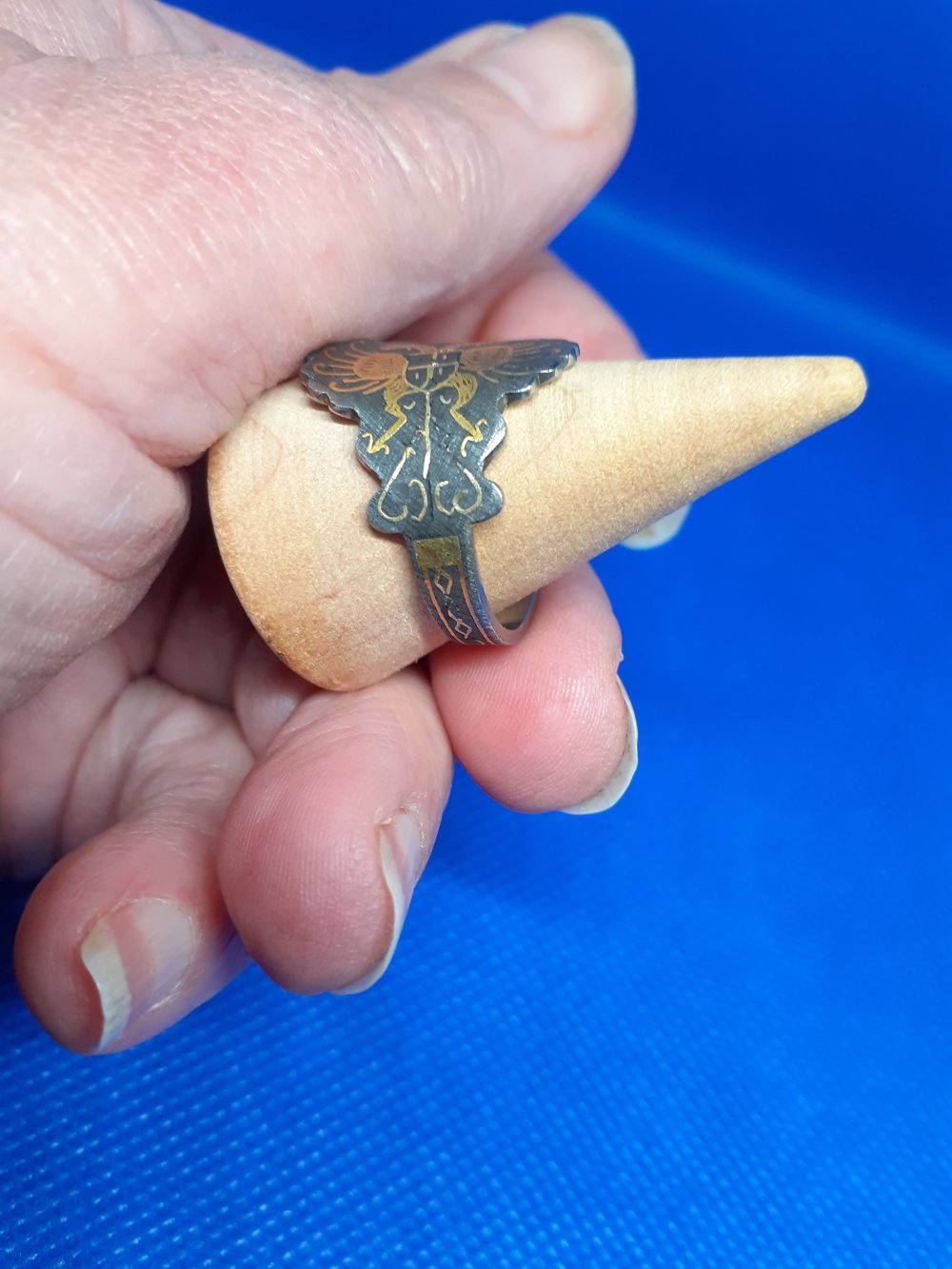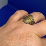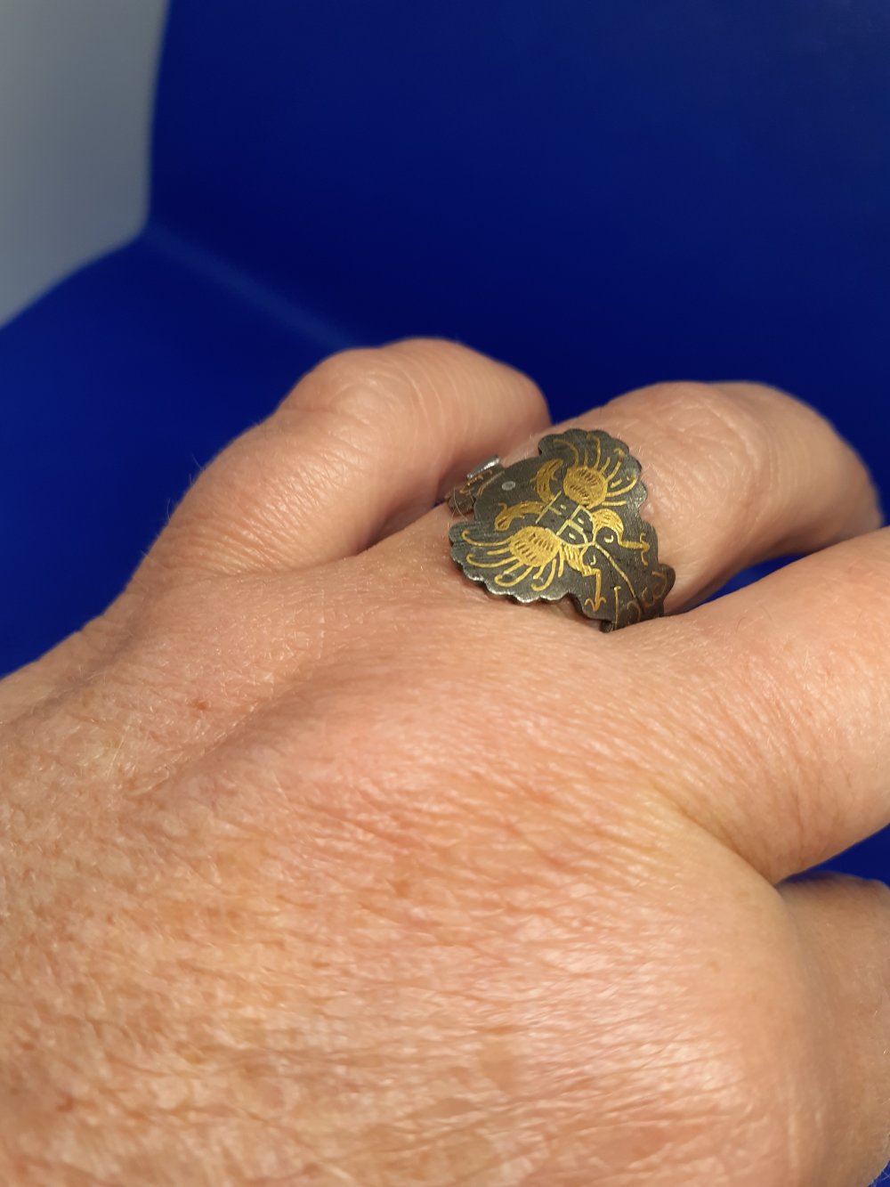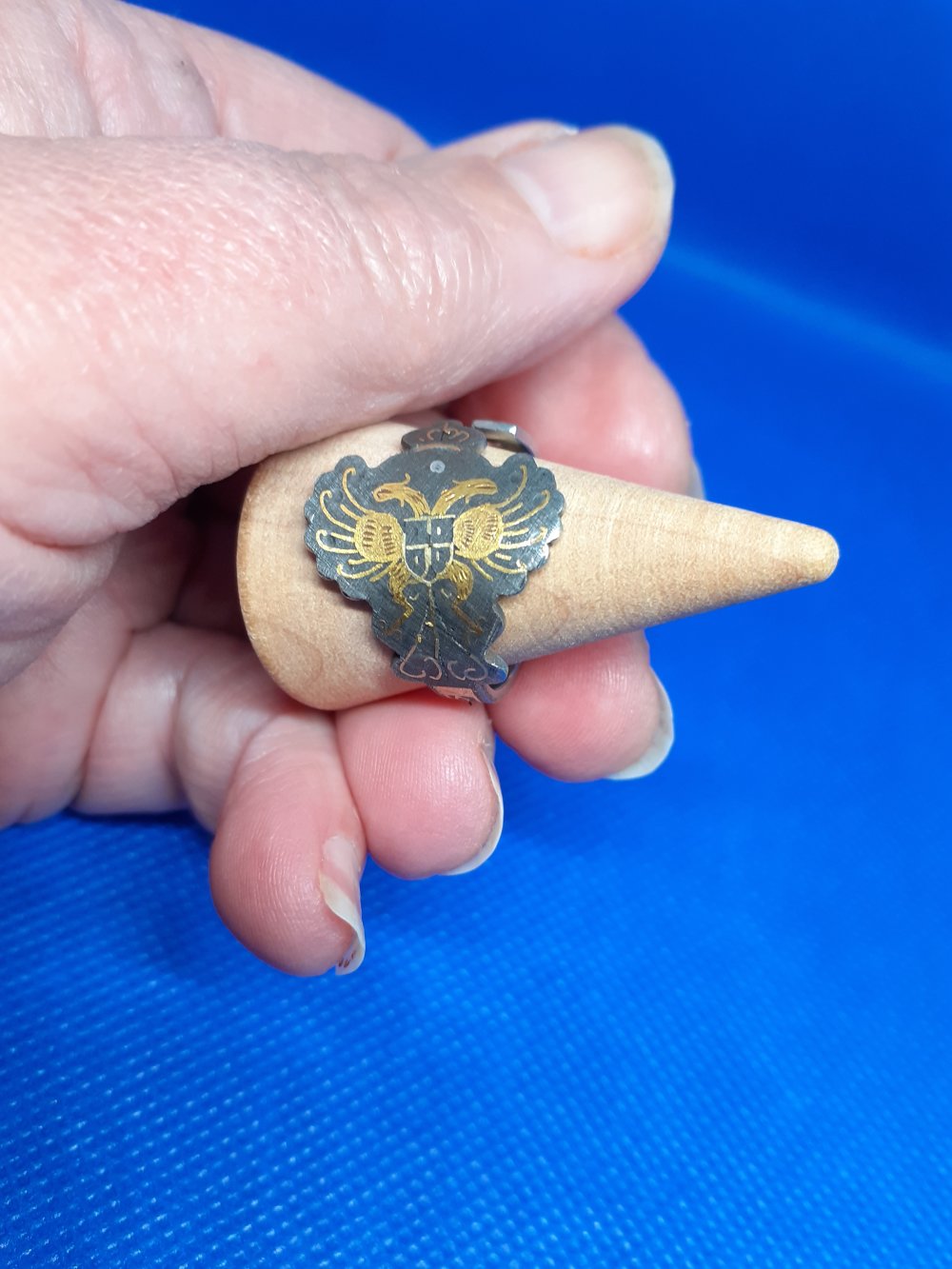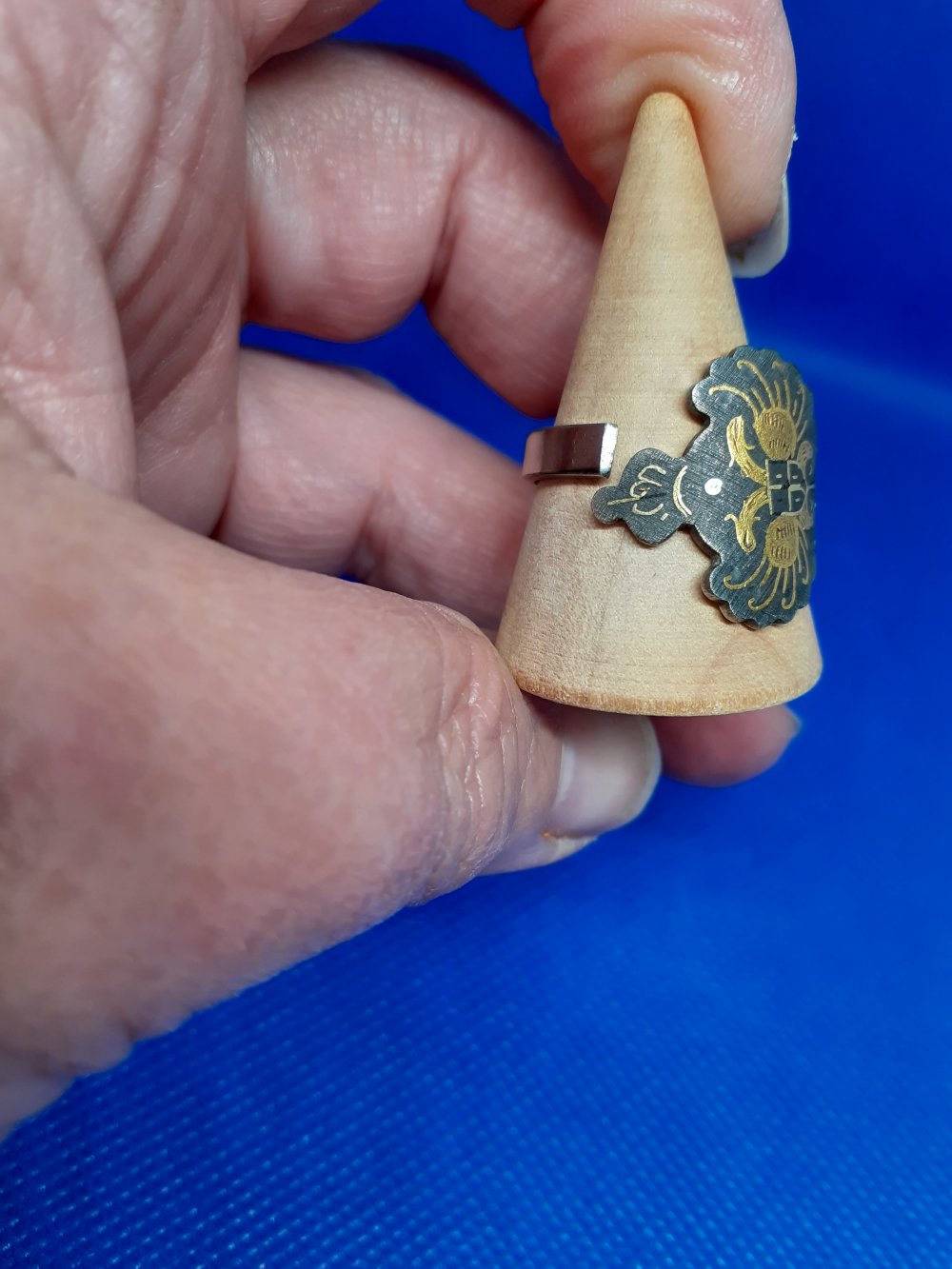 Bague unique façonnée à partir d’un véritable manche de cuillère ancienne, décorée d’un emblème doré aux ailes déployées, évoquant un royaume ancien et magique.