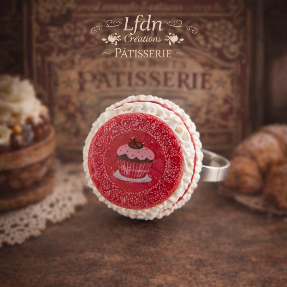 Bague gourmande en forme de macaron pâtissier, décorée d’un cabochon effet pâtisserie avec motif cupcake. Réalisée à la main en pâte polymère, elle offre un rendu réaliste et délicatement sucré, idéal pour les amateurs de bijoux originaux.