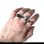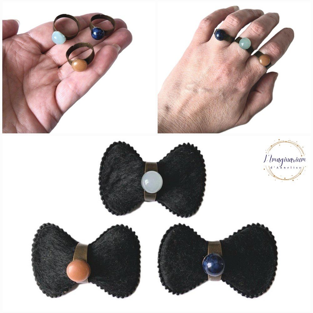 Corisandre est représentée par 3 bagues ajustables et minimalistes, en métal couleur bronze, avec des cabochons ronds de 10 mm en pierres naturelles orange, vert d'eau et bleue foncée.