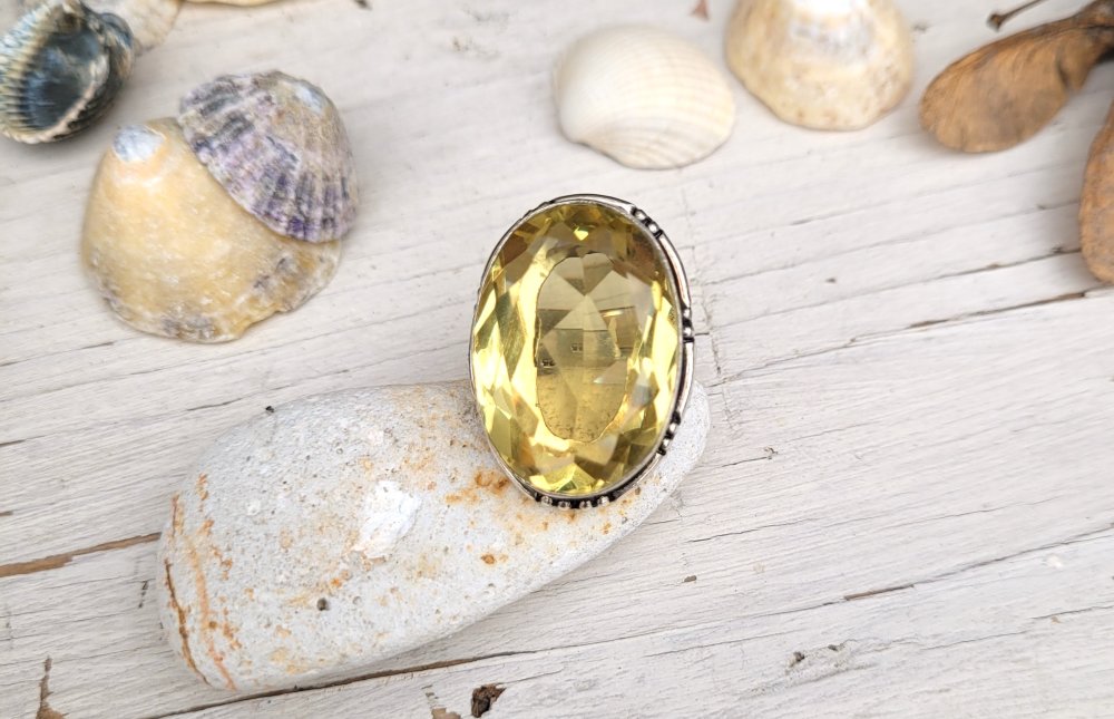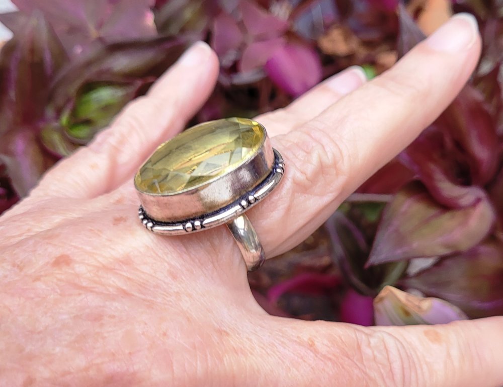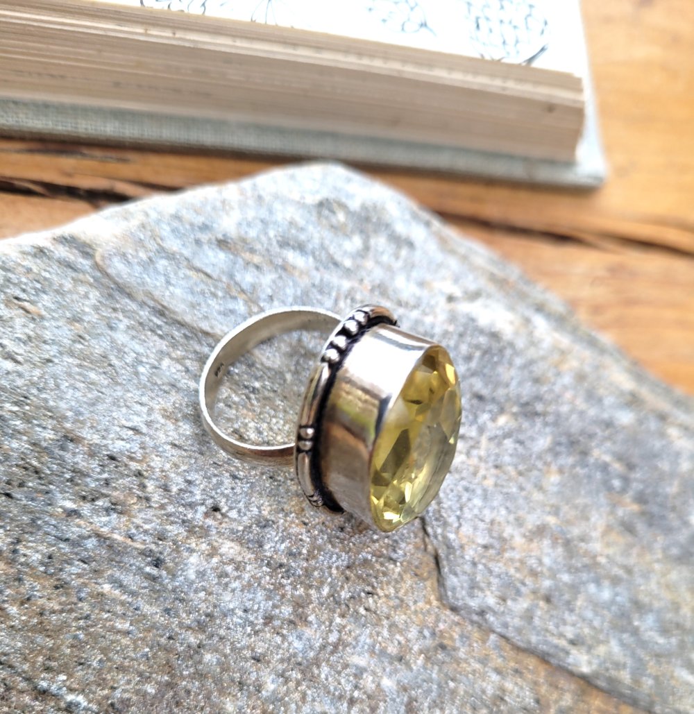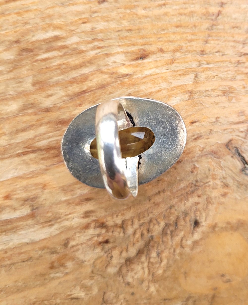 Du côté vintage : une bague taille 59.5 en argent massif 925 avec un gros cabochon de citrine facettée !!!!