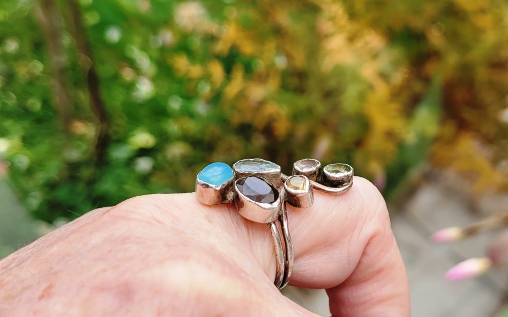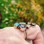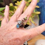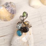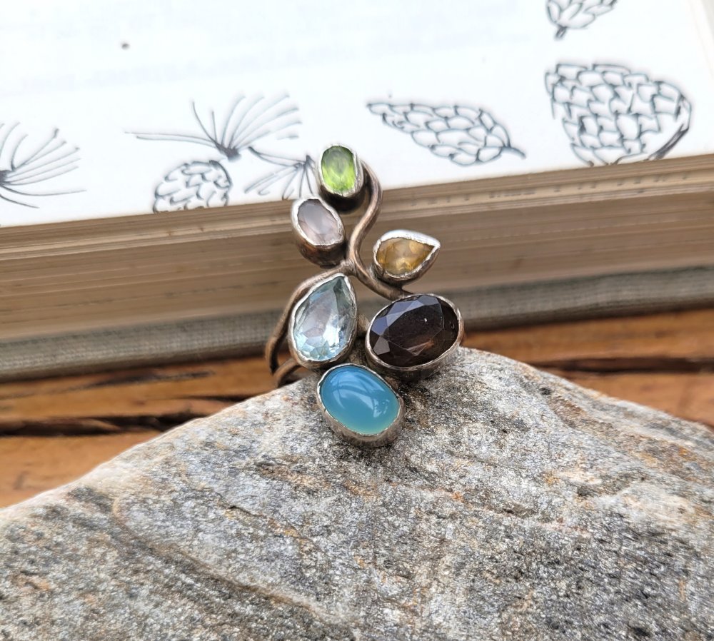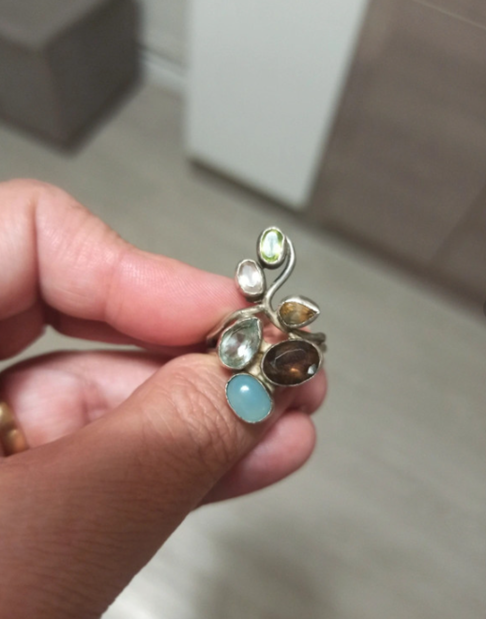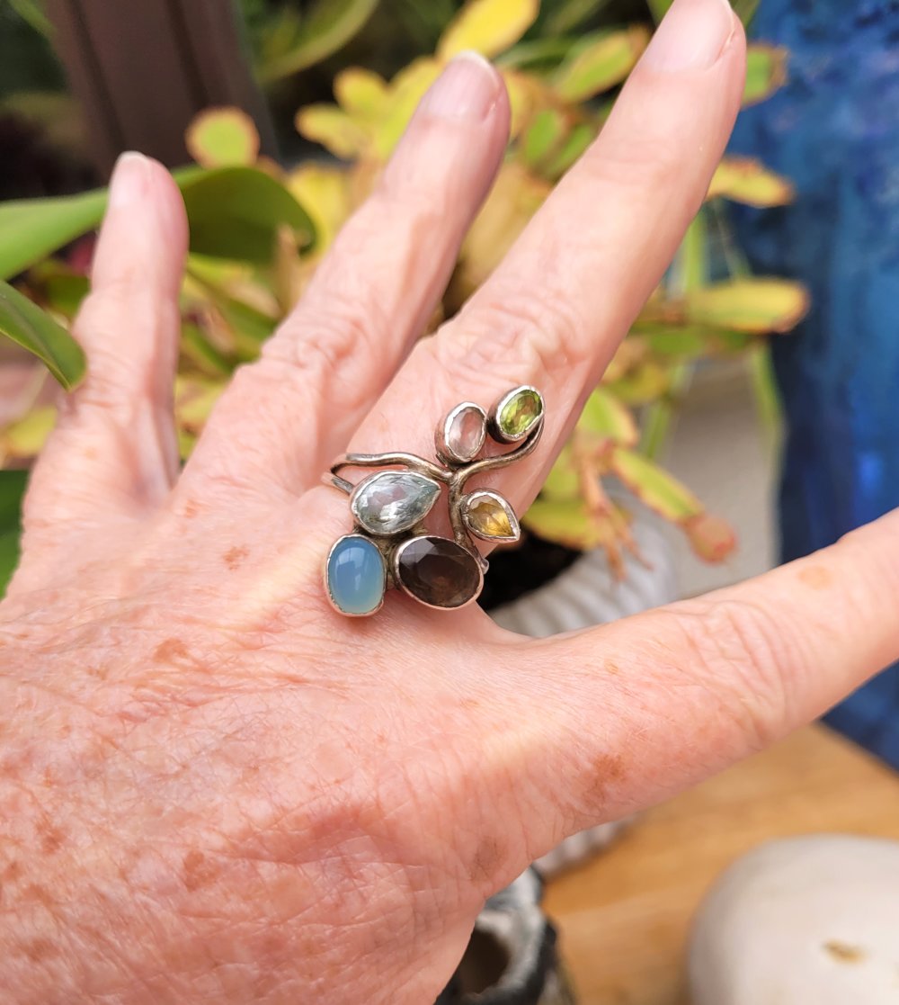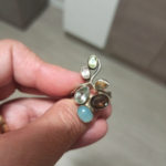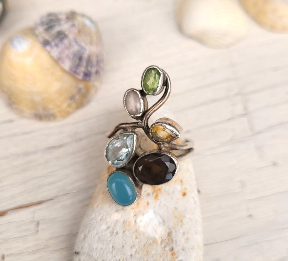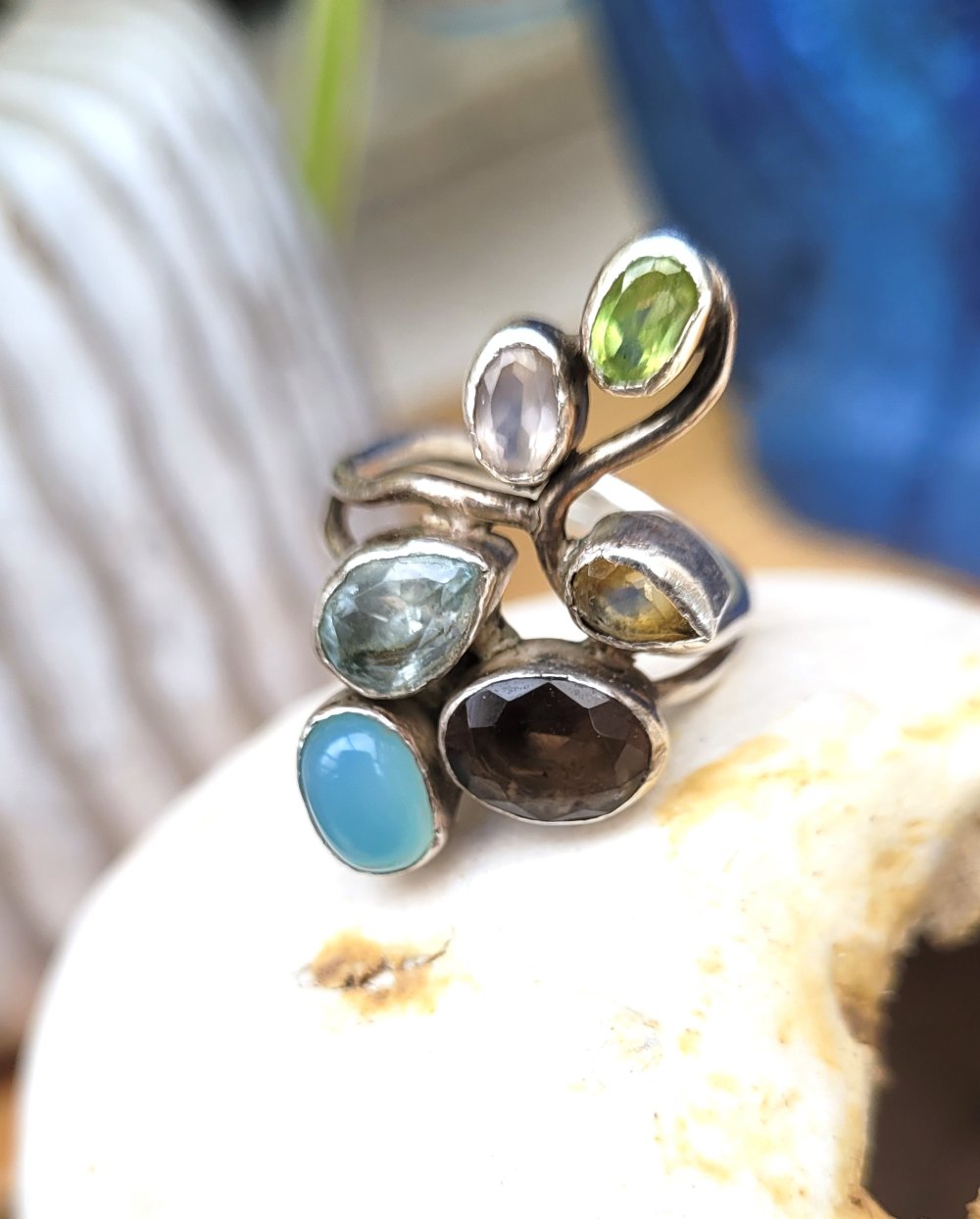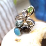 Côté vintage : une bague de toute beauté multi-pierres en argent massif 925 ,taille 59-60 ....: cabochons : amazonite, quartz fumé, péridot, citrine, aigue marine, cristal clair ..