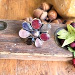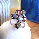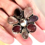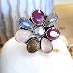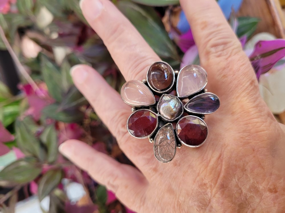 Une bague ajustable contemporaine de ma collection ; en argent massif 925; avec superbes cabochons de pierres...: rubis, quartz rutile, quartz fumé, perle baroque, quartz rose et améthyste ...