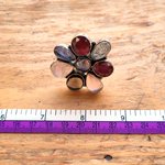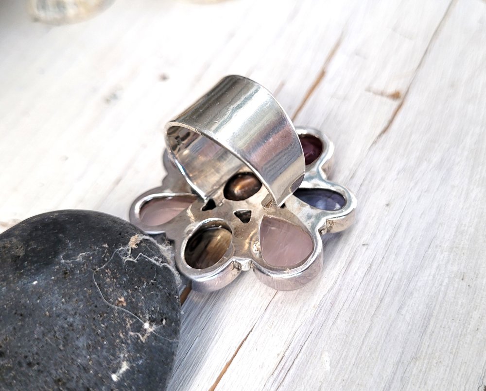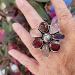 Une bague ajustable argent massif 925 avec superbes cabochons rubis, quartz rutile, quartz rose, perle baroque ...