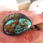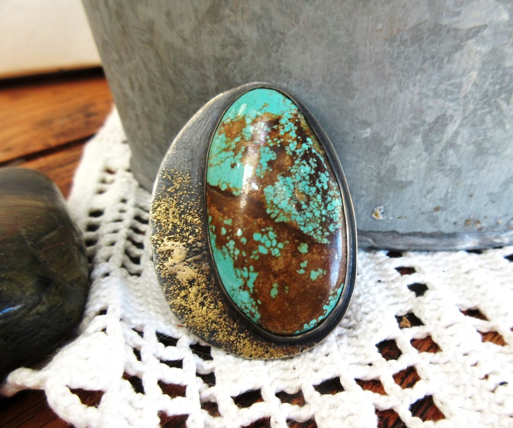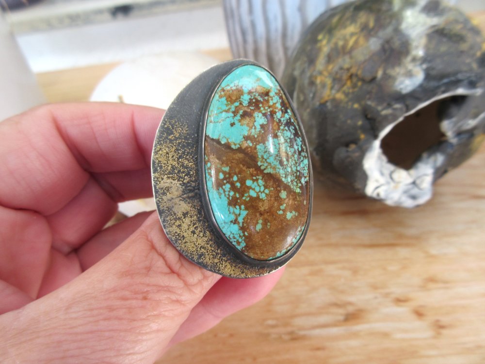Une bague argent massif 925 avec pépites d'or et un splendide cabochon rare turquoise mine 8 .... pour le côté vintage !!!!