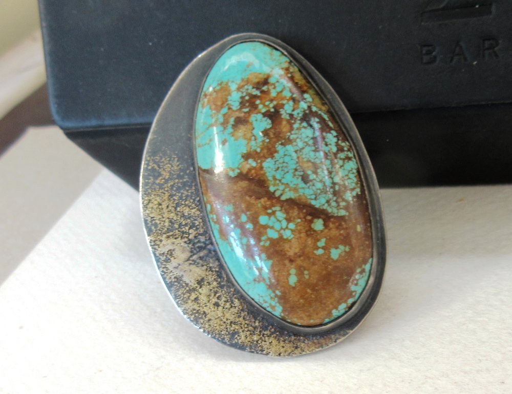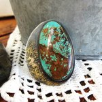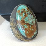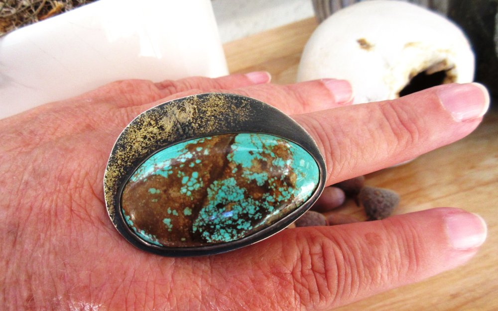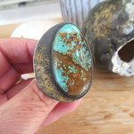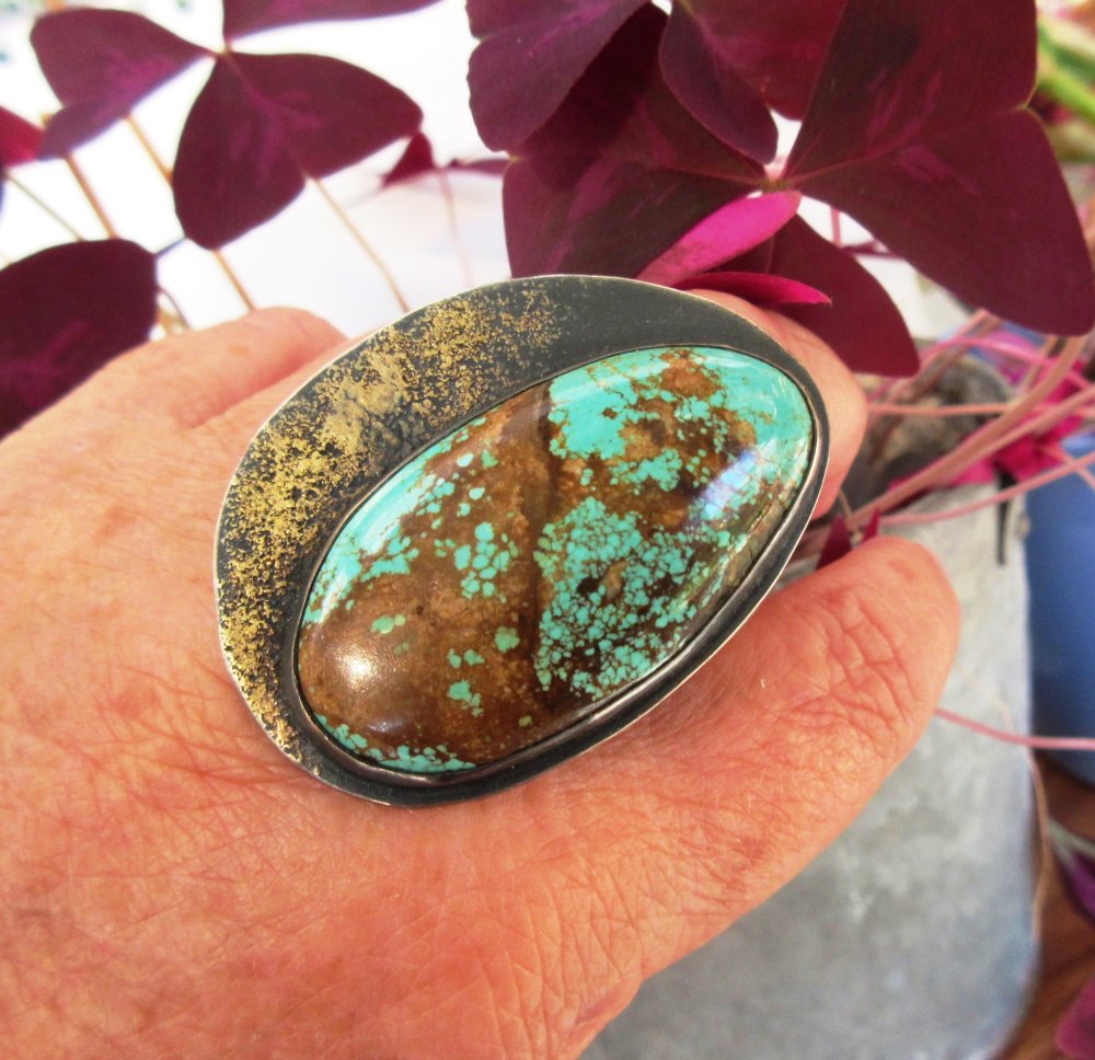 Une bague argent massif 925 avec pépites d'or et un splendide cabochon rare turquoise mine 8 - 44/24 mm- de ma collection privée de pierres, sublime travail de glaçage avec l'or sur l'argent noirci , le dos de la bague est également gravé avec arbre de vie : pour le côté vintage !!!!