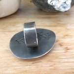 C'est une bague vintage unique de ma collection privée, en argent 925 (déstockage): la taille est 61 ( vu la largeur de l'anneau ) : dimension de la bague = 50/35 mm et l'anneau = 9 mm= diamètre 20 mm : elle sera expédiée en recommandé dans une jolie boîte cadeau.