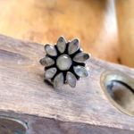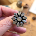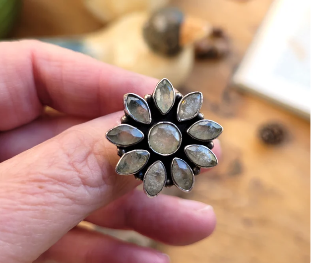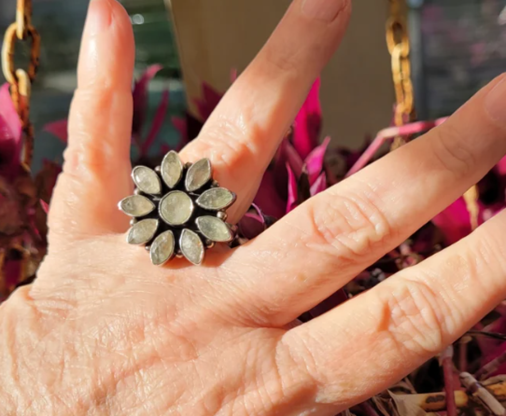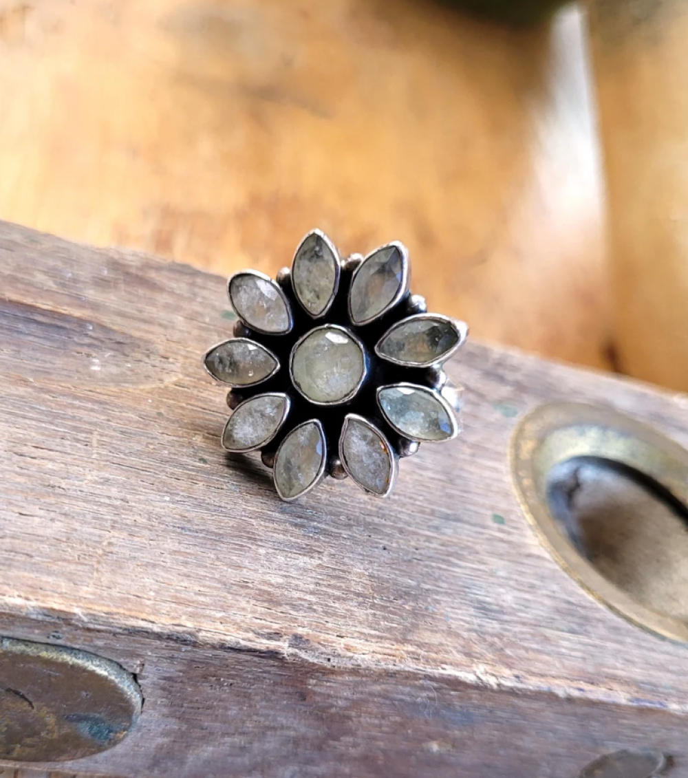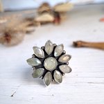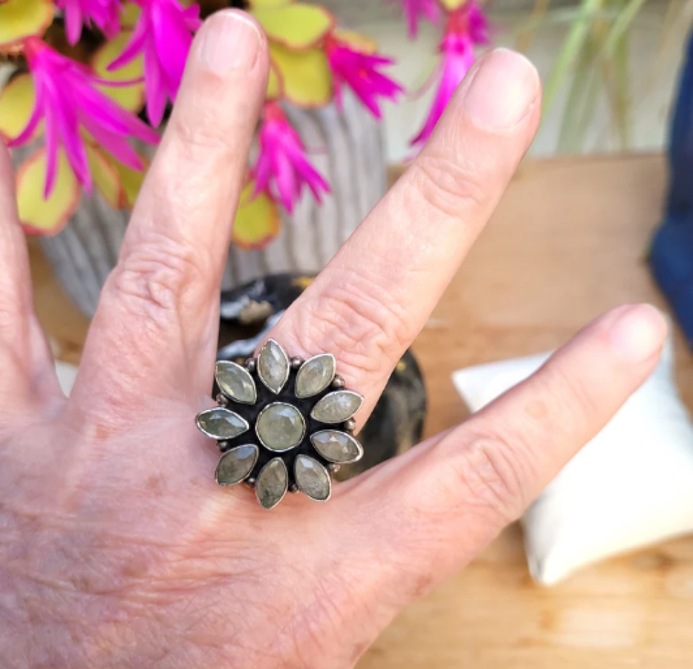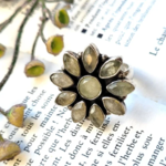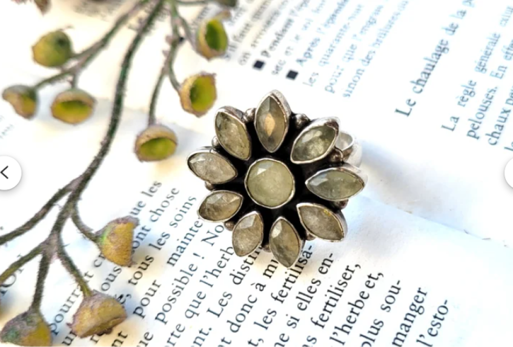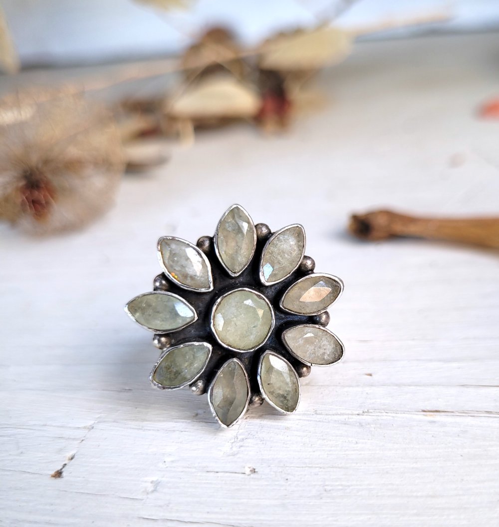 Une bague argent massif fait main taille 58.5, avec splendides pierres aigue marine de couleur verte, forme de fleur pour le côte vintage
