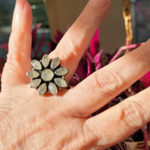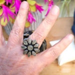 Côté vintage: Une bague argent massif fait main taille 58.5, avec splendides pierres aigue marine de couleur verte, forme de fleur