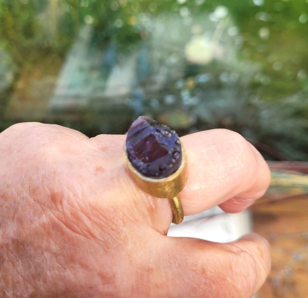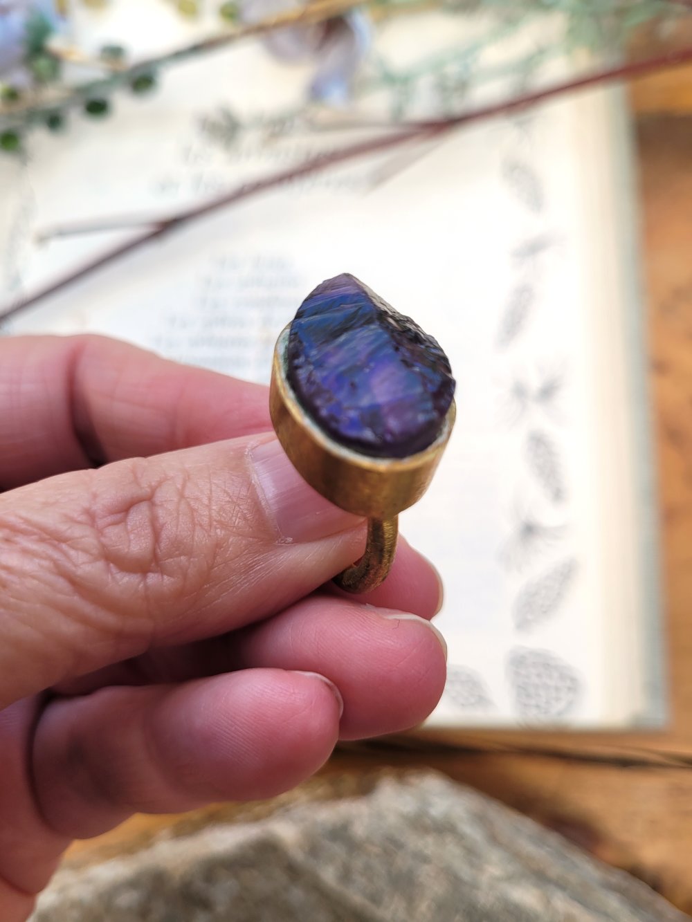 Une bague ajustable laiton massif brossé, faite main avec un superbe cabochon d'améthyste brute .... pour le côté vintage !!!!