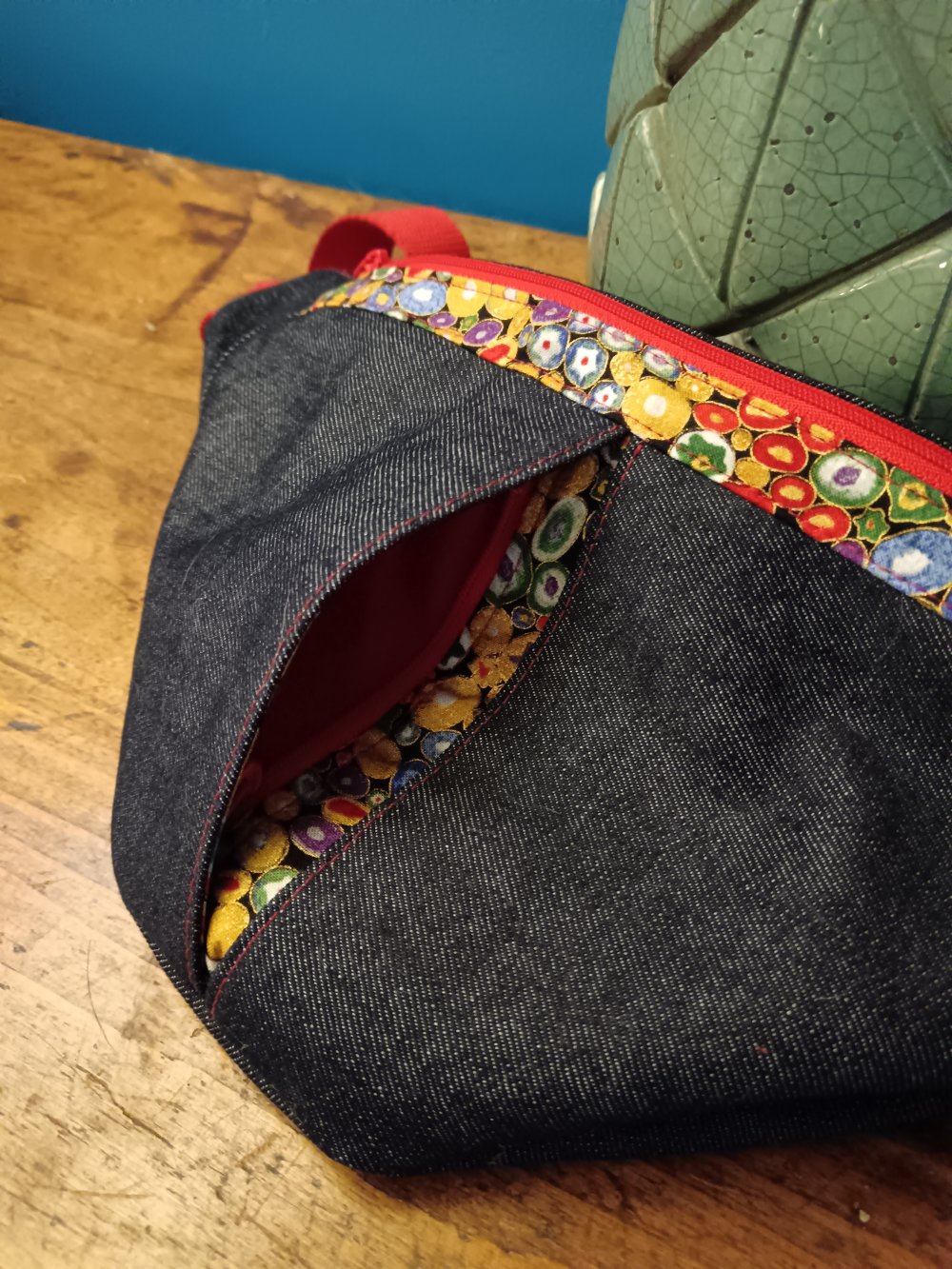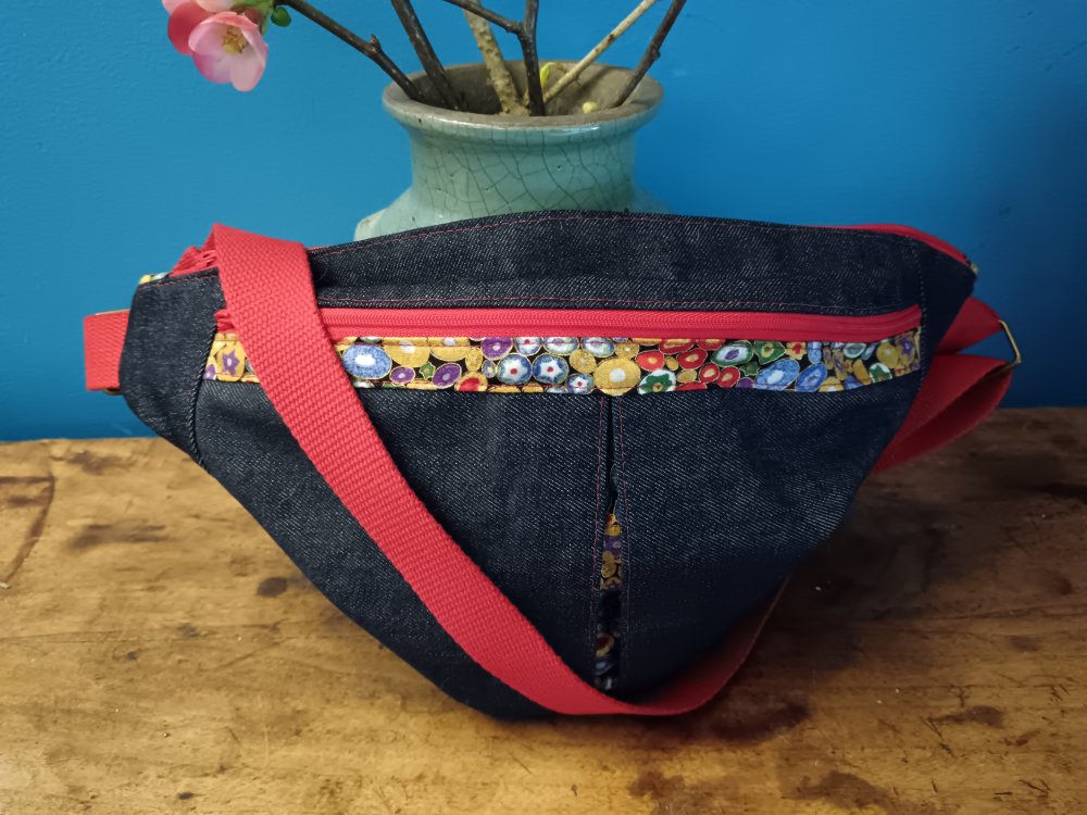Une banane compacte mais de grande contenance. Elle est dotée de 4 poches : 2 grandes et 2 poches cachées à l'avant. C'est une pièce unique faite à la main.