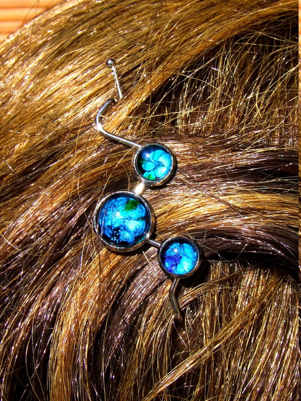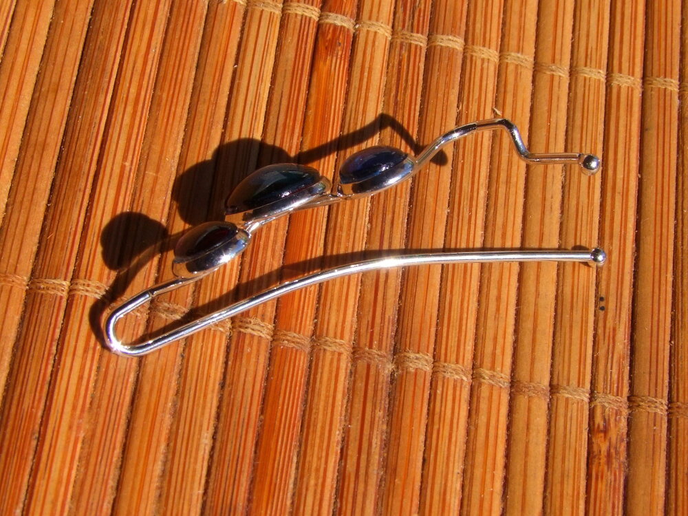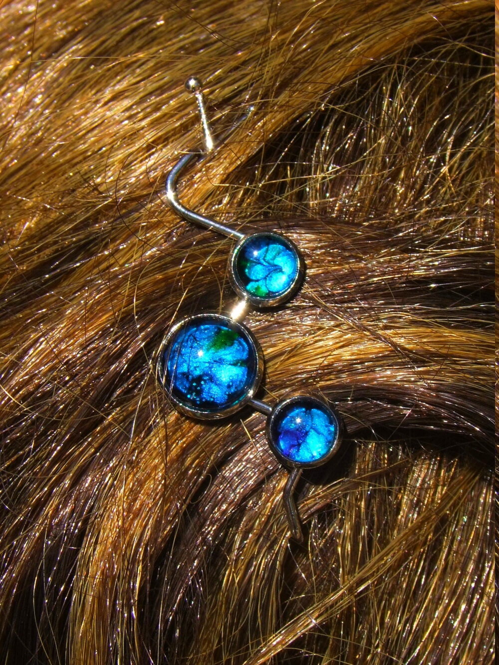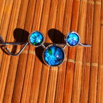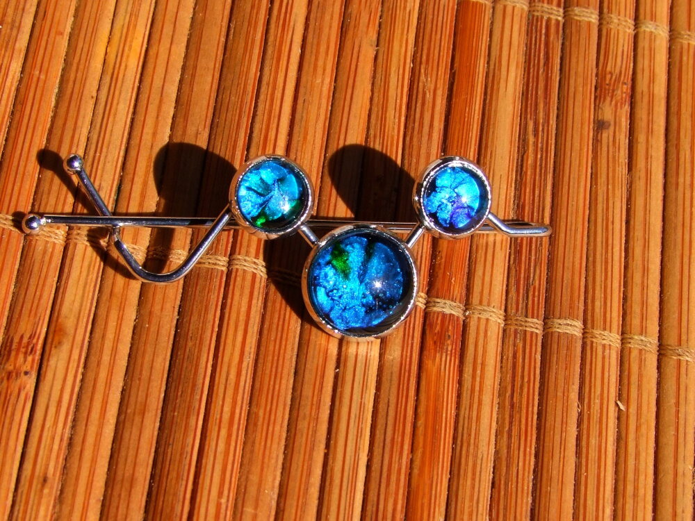 Support barrette en acier inoxydable équipé de trois cabochons en verre dont j'ai réalisé la coloration à l'aide d'une technique Unique de coloration brevetée par NAZCA SPIRIT !