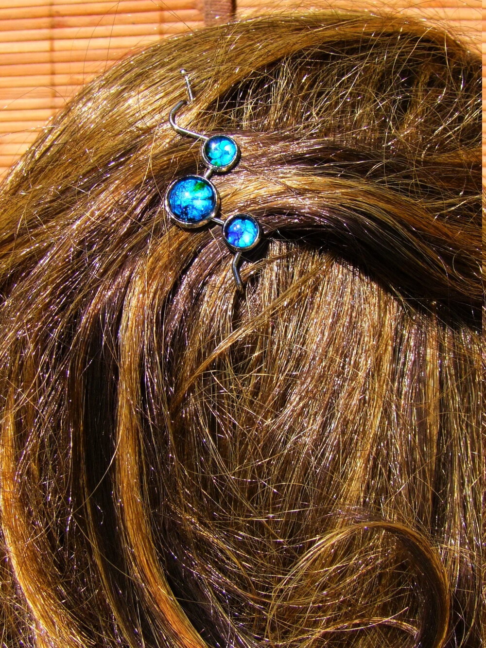 Barrette Bohème Acier Inox Cabochons en Verre Coloration Artisanale Création Unique Hand Made France - Turquoise et Bleu Cobalt Iridescent