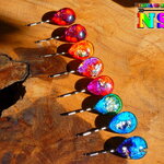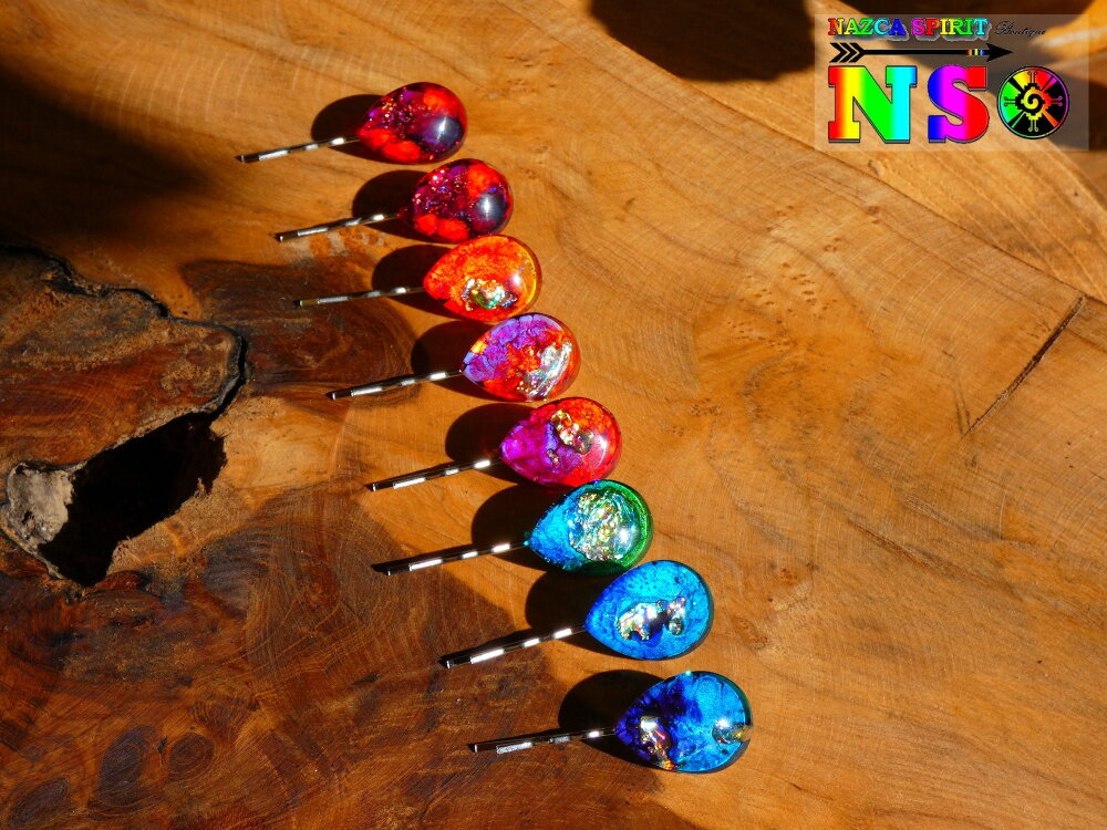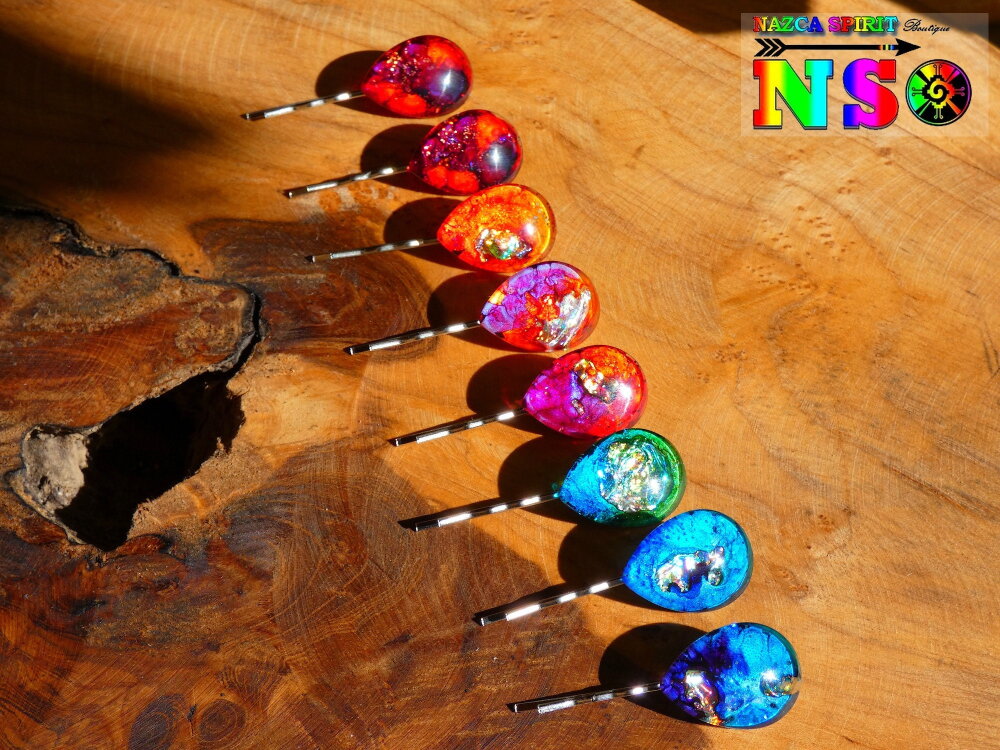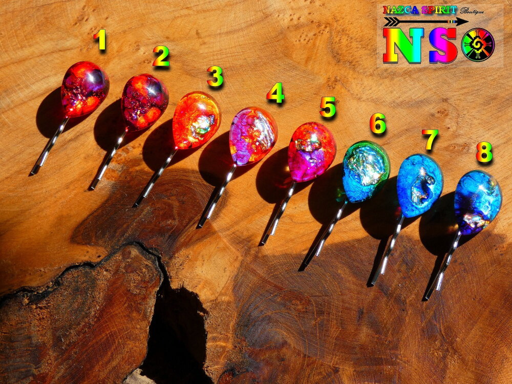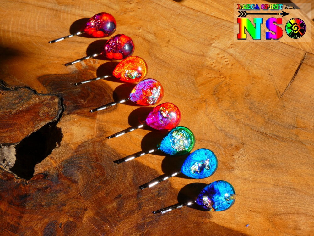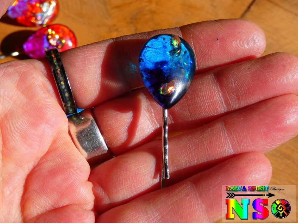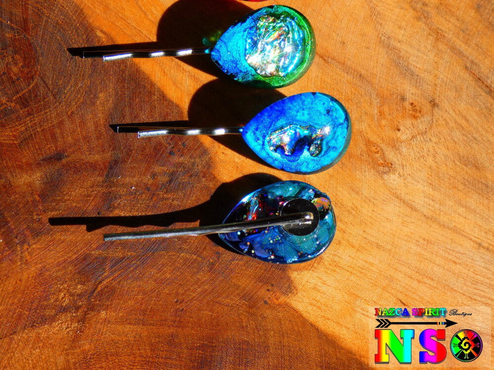 Je vous propose de découvrir de très jolies pinces à cheveux en acier inoxydable de 5 cm ("1.96) de long x 2 cm ("0.78) de large surmontées d'un superbe cabochon forme goutte coloré à la main à l'aide d'une technique de coloration que j'ai inventée en 2013, procédé technique unique enregistrée auprès de l'I.N.P.I (Institut National de la Protection Industrielle) sous le numéro national DSO2017003817.