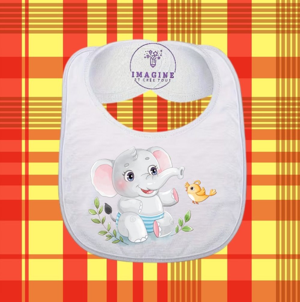 Bavoir - sublimation - impression infusible ink - baby elephant - oiseau - feuilles - bébé éléphant - personnalisation