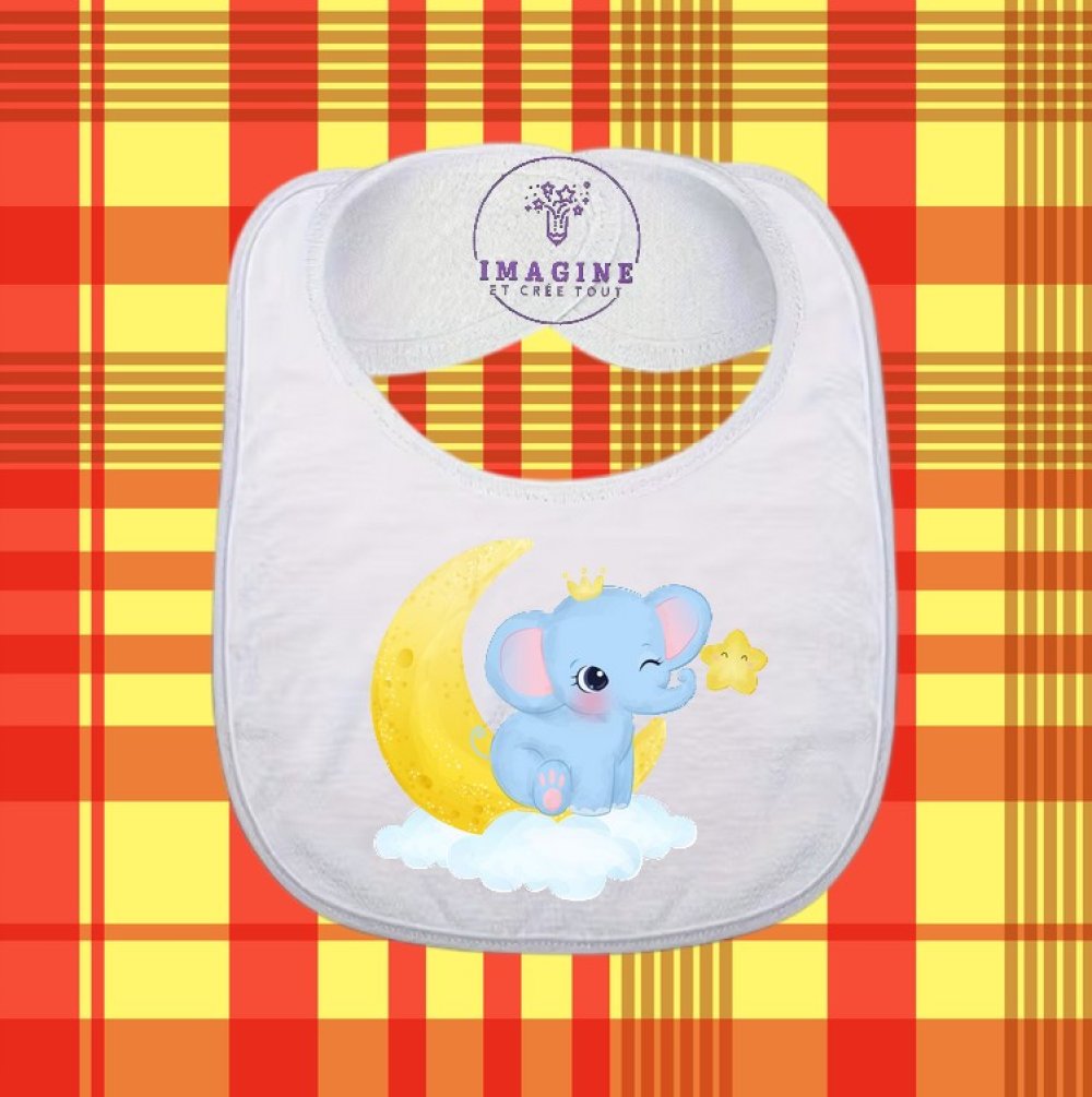 Bavoir - sublimation - impression infusible ink - cute baby elephant - illustration - lune - nuage - couronne - étoile