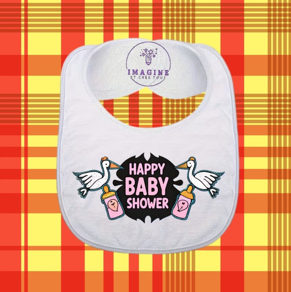 Bavoir - sublimation - impression infusible ink - happy baby shower - révélation - cigognes - biberons - fille