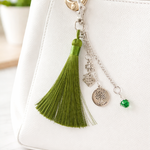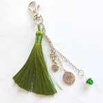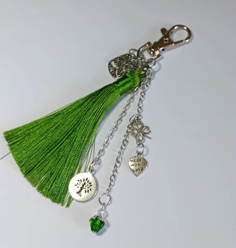 Touche Précieuse : Une breloque trèfle et un cristal facetté vert transparent en terminaison de chaîne.