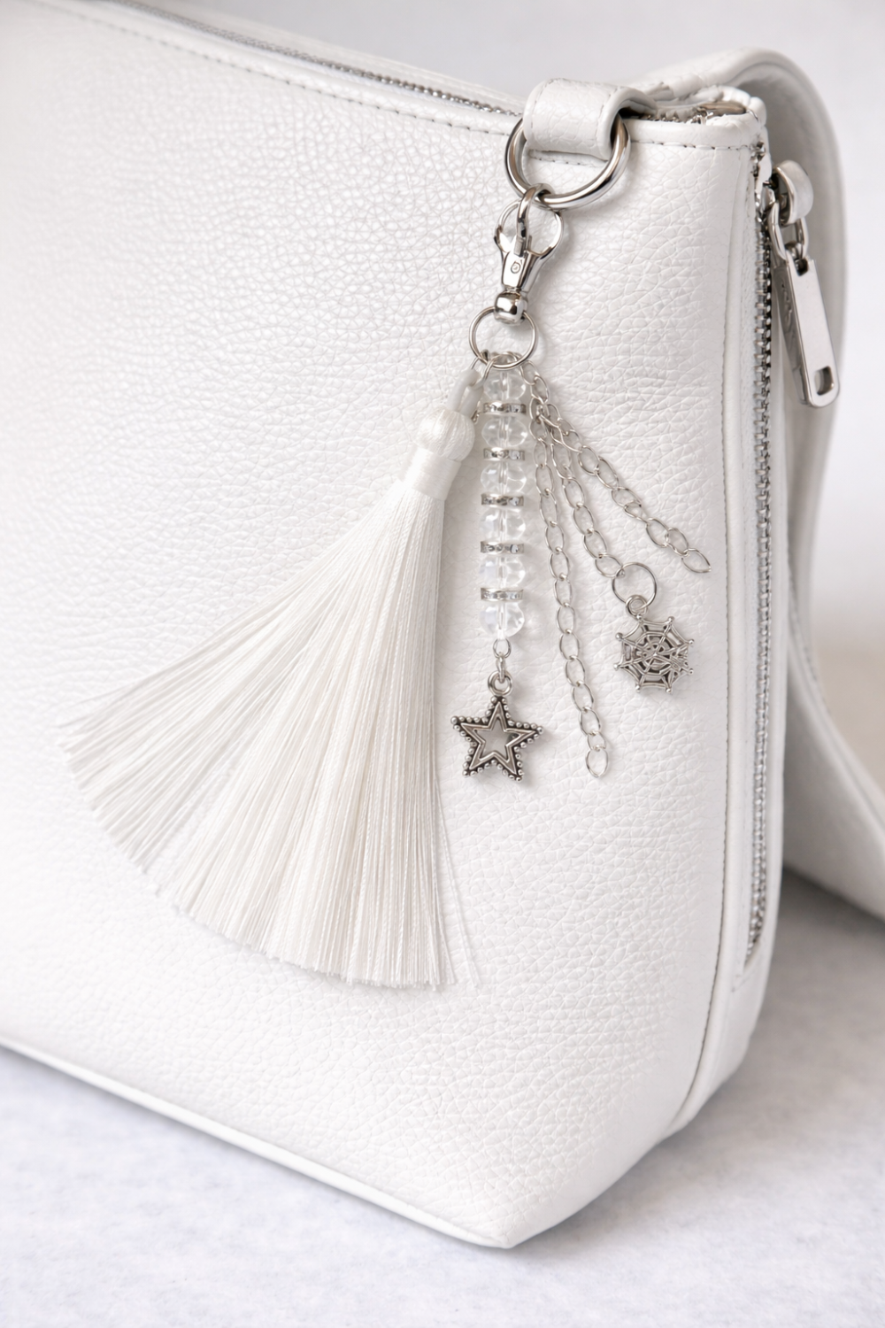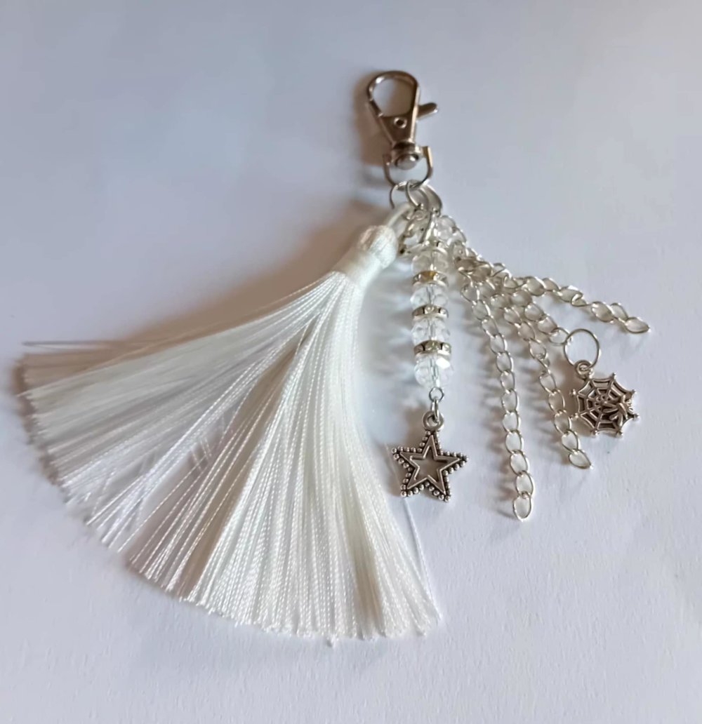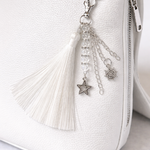 Ajoutez une note de raffinement et de spiritualité à votre sac préféré avec ce bijou de sac unique. Son élégant pompon en soie blanche est accompagné de breloques symboliques et de perles délicates.