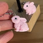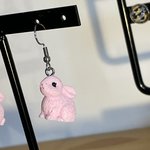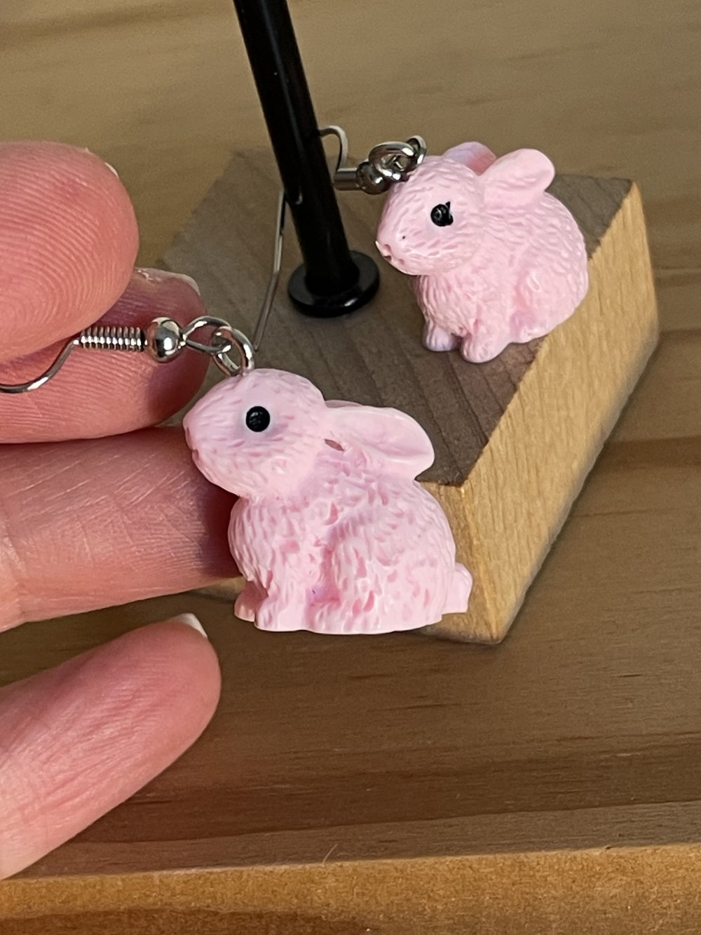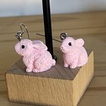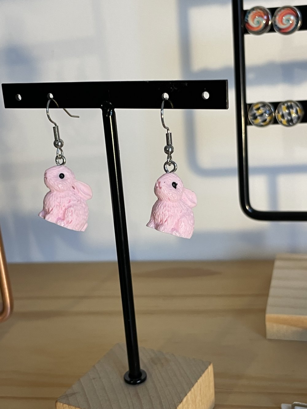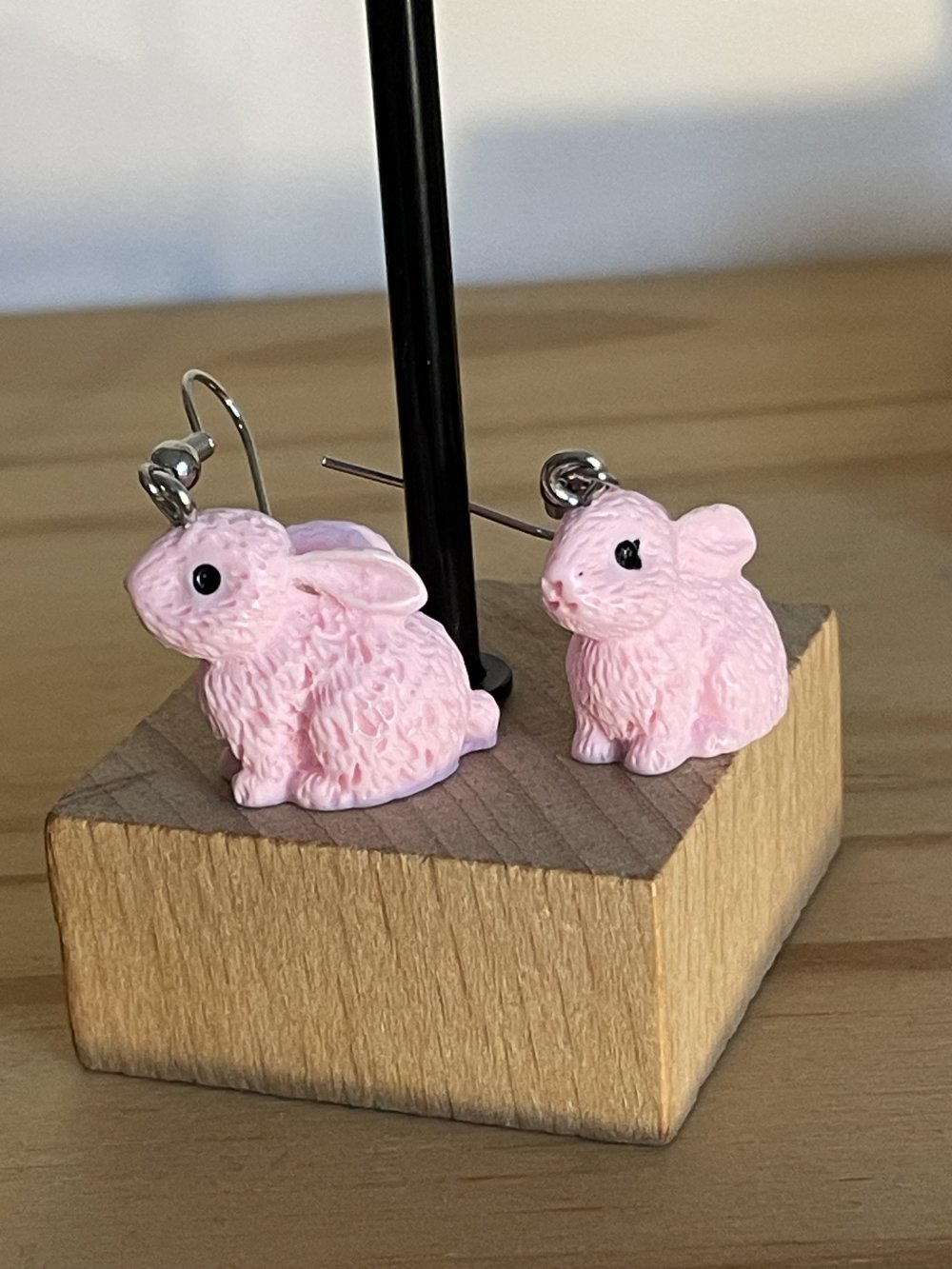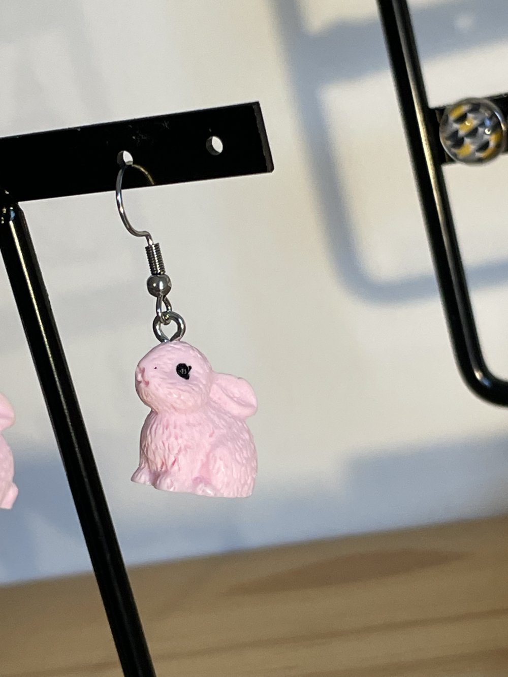 Boucles d’oreilles avec deux petits lapin, rose très légers en résine. Les attaches sont en acier inoxydable et je rajoute des embouts en silicone pour fermer. Paquet cadeau et envoi soigné.