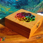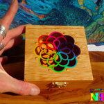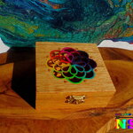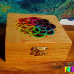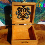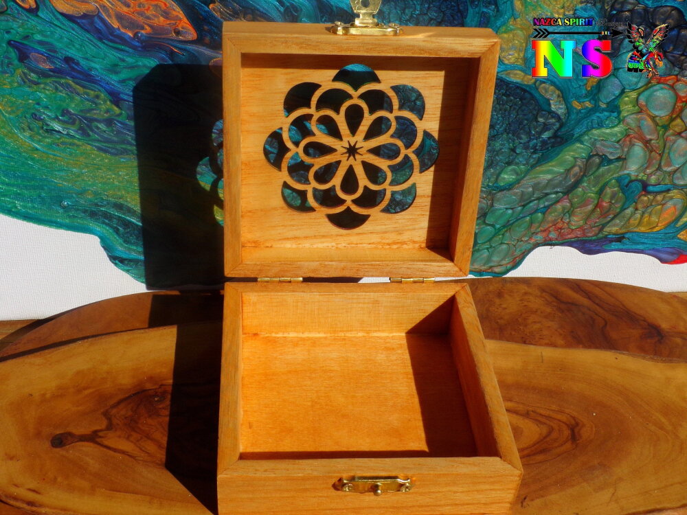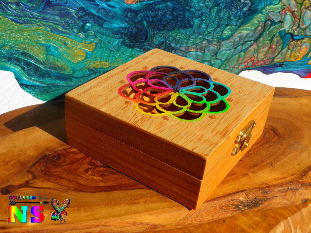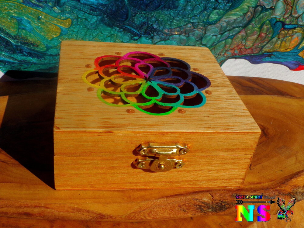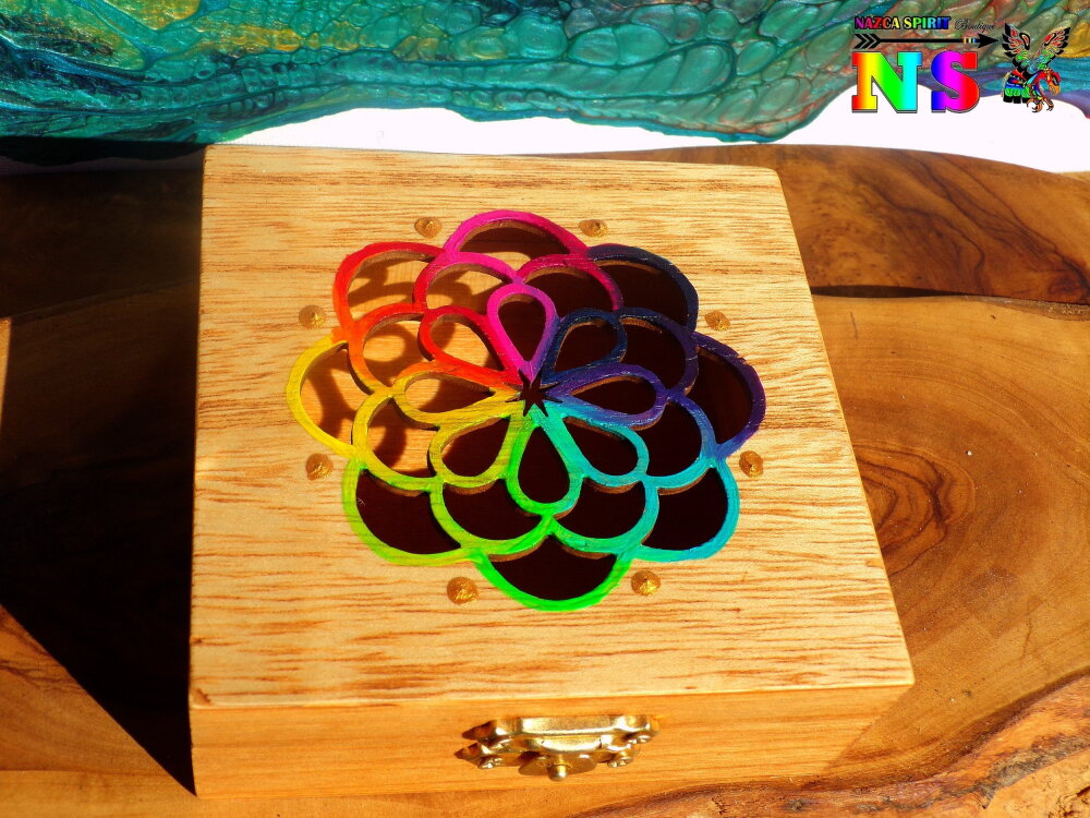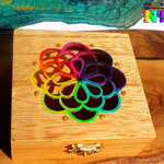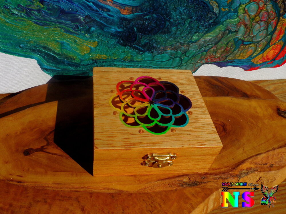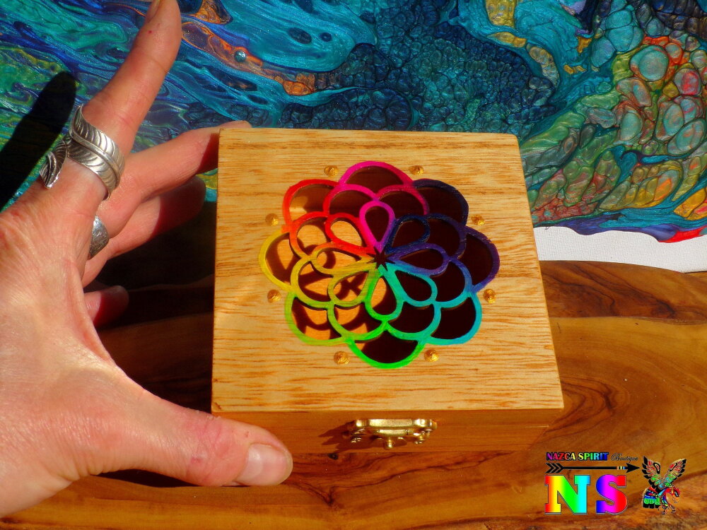 Le couvercle est ciselé d'un très joli motif représentant un attrape-rêves. Pour apporter de la lumière et un joli contraste avec la couleur du bois, j'ai utilisé des peintures acryliques iridescentes et des peintures or pour rehausser les détails des motifs floraux.