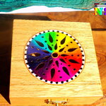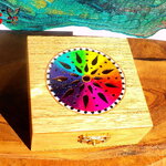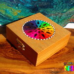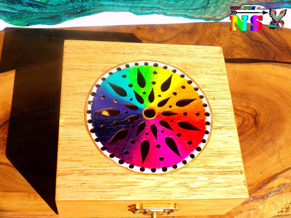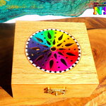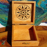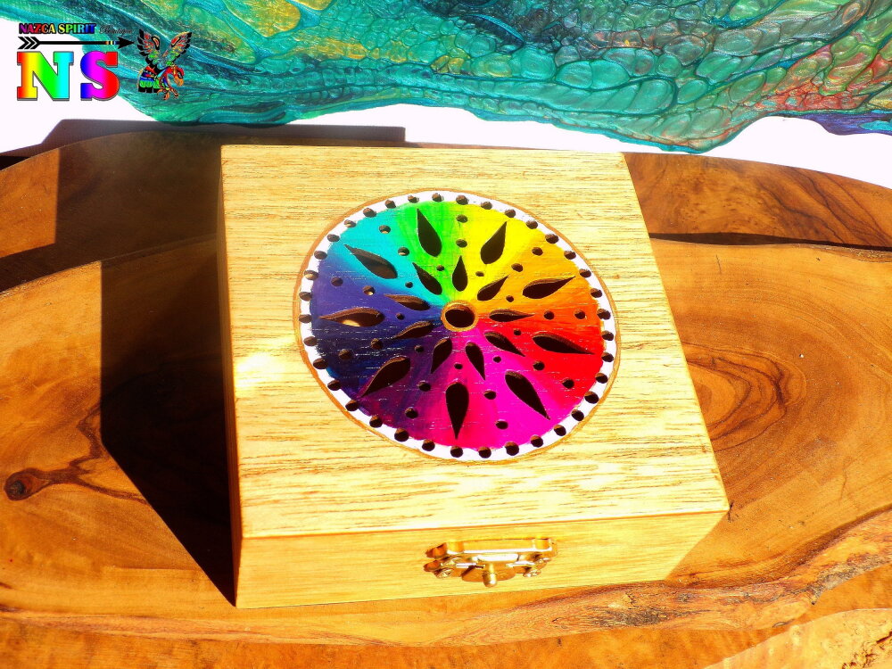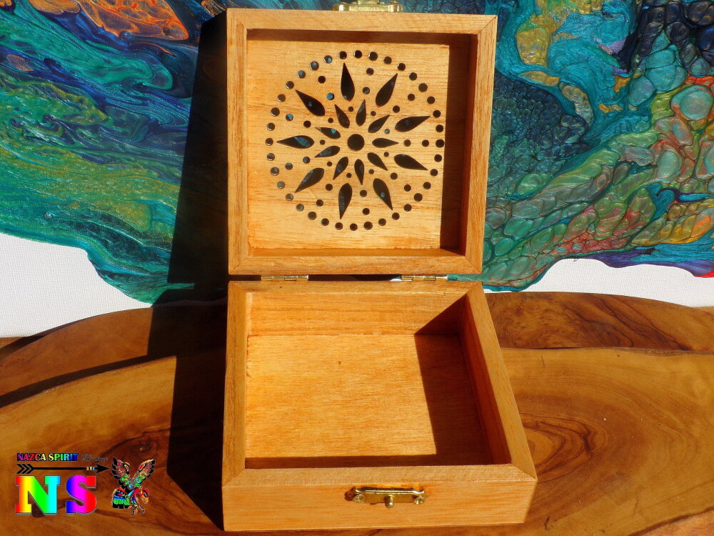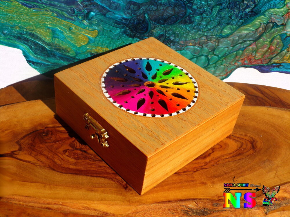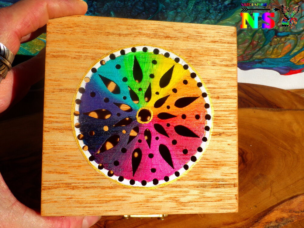 Le couvercle est ciselé d'un très joli motif représentant un attrape-rêves. Pour apporter de la lumière et un joli contraste avec la couleur du bois, j'ai utilisé des peintures acryliques iridescentes et des peintures or pour rehausser les détails des motifs floraux.