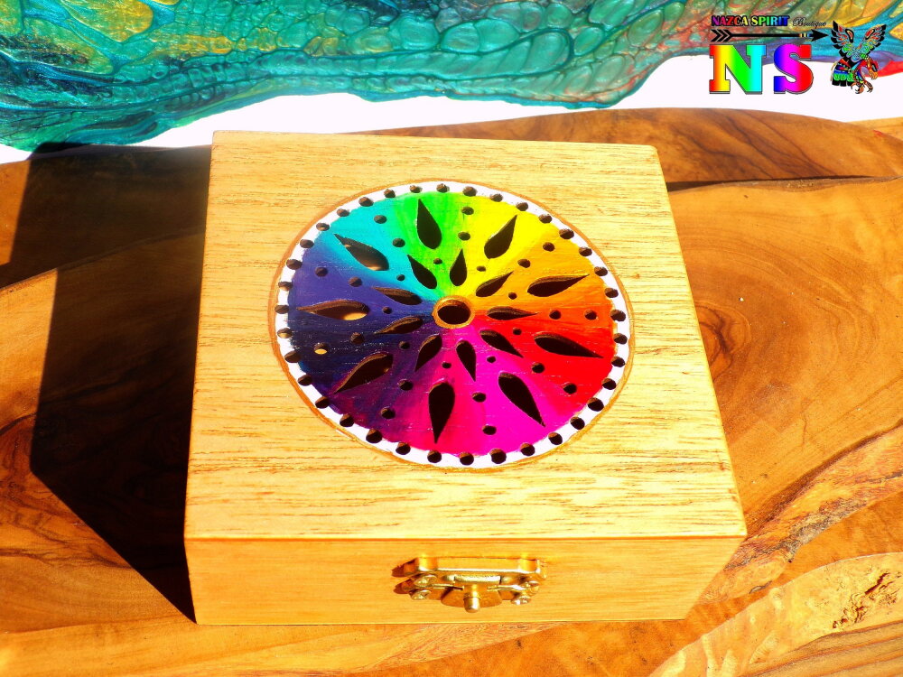 Boite à bijoux bohème en bois pin ciselé - Motif attrape rêve ciselé - Coffret artisanal peint à la main - Boite multicolore et or