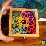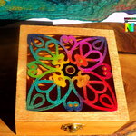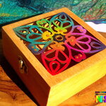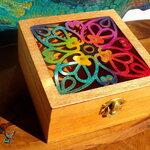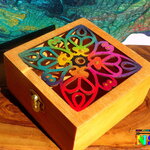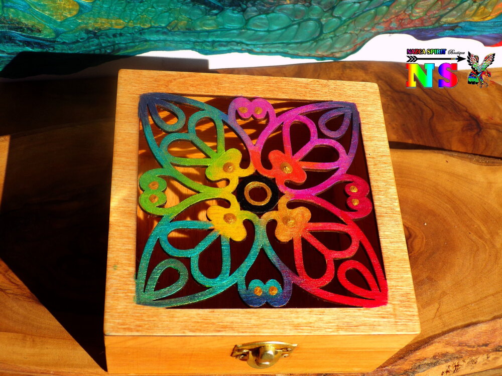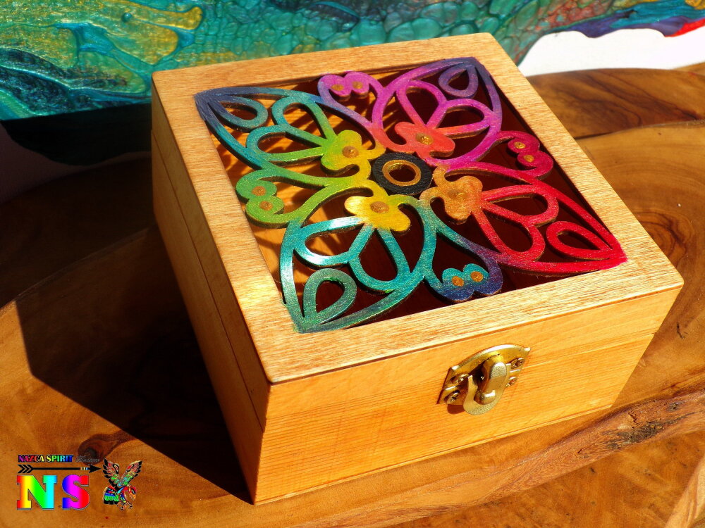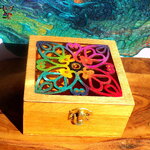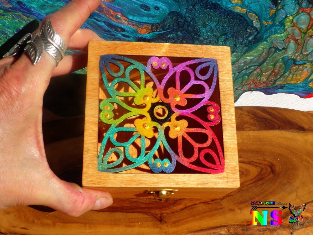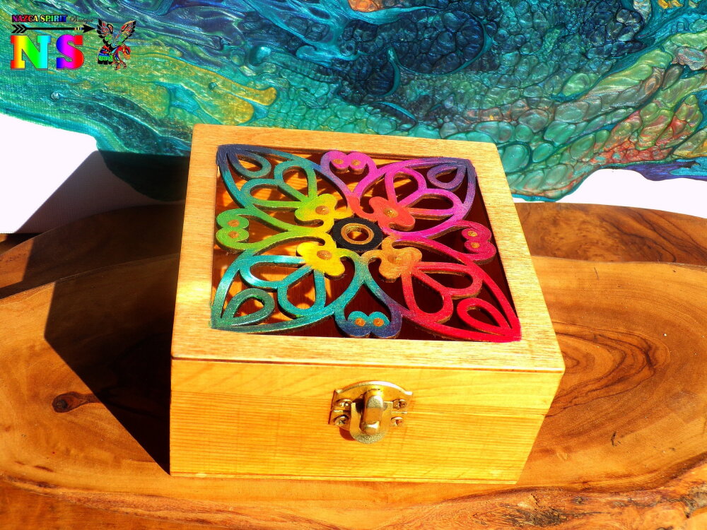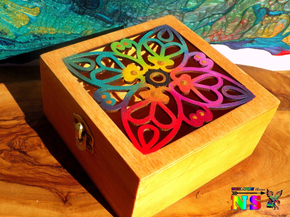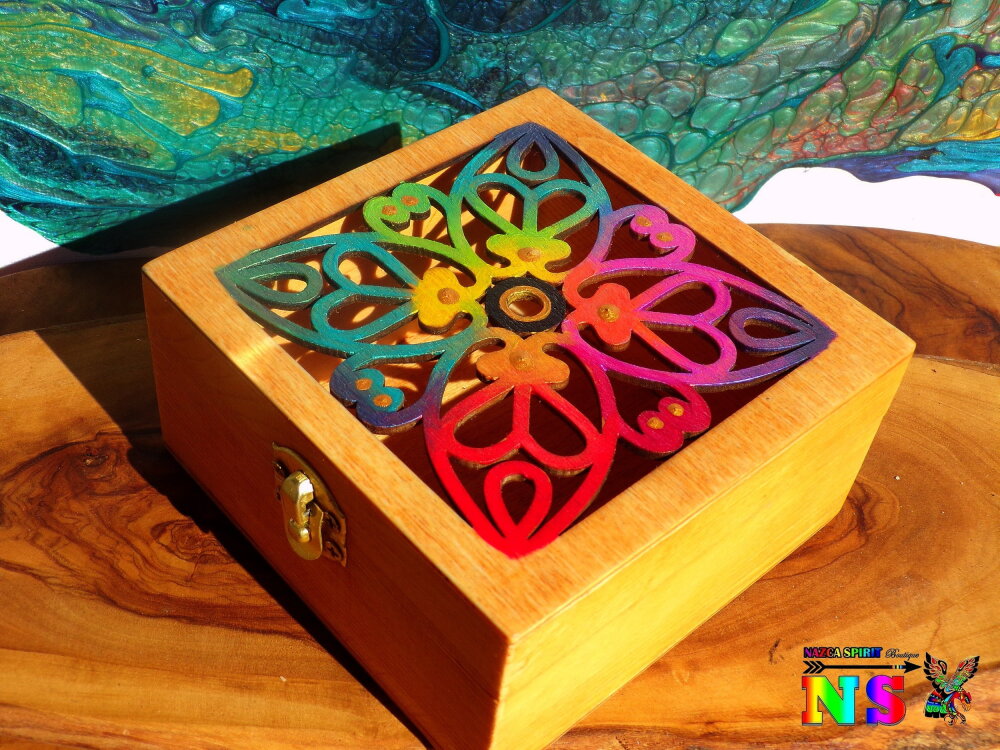 Boite à bijoux bohème en bois pin ciselé - Motifs Floraux ciselés - Coffret artisanal peint à la main - Boite multicolore iridescente et or.