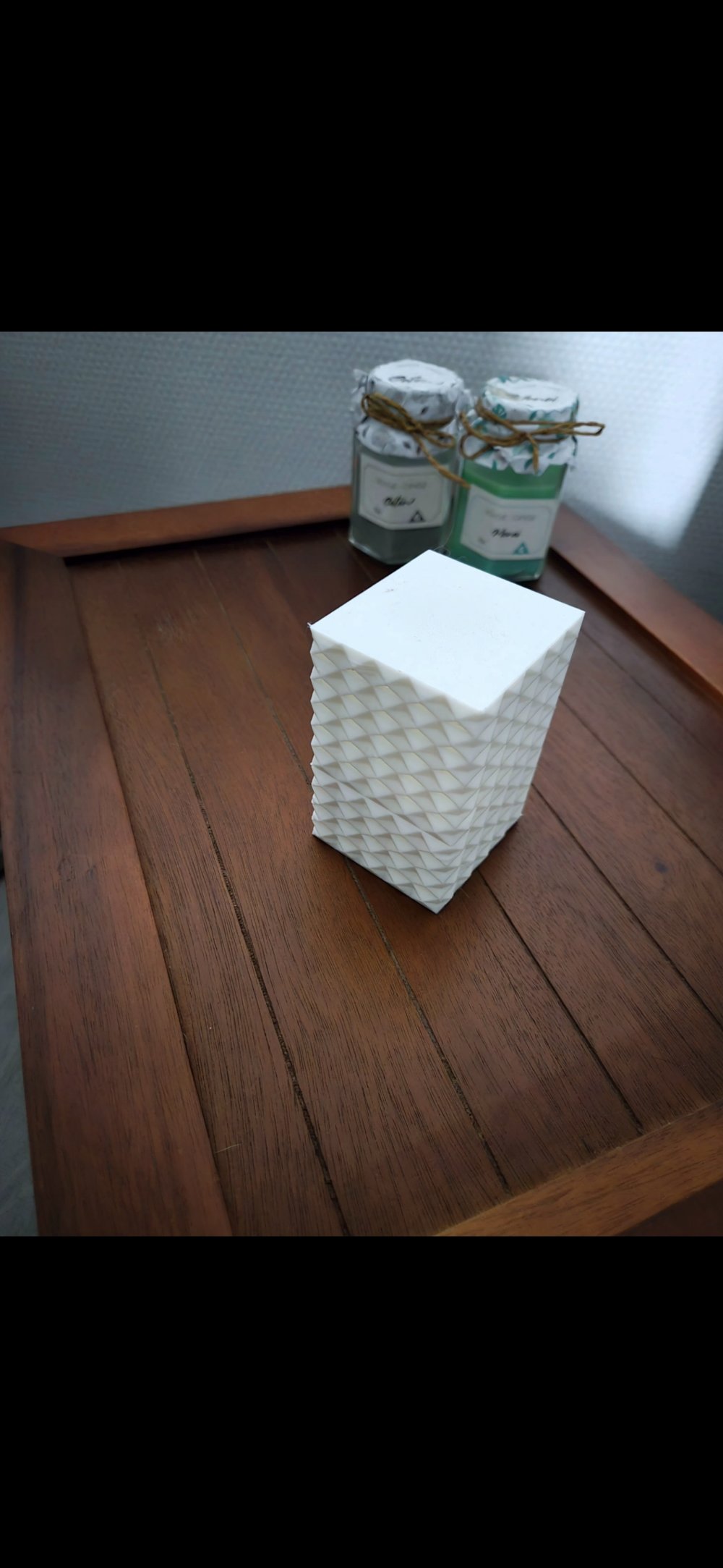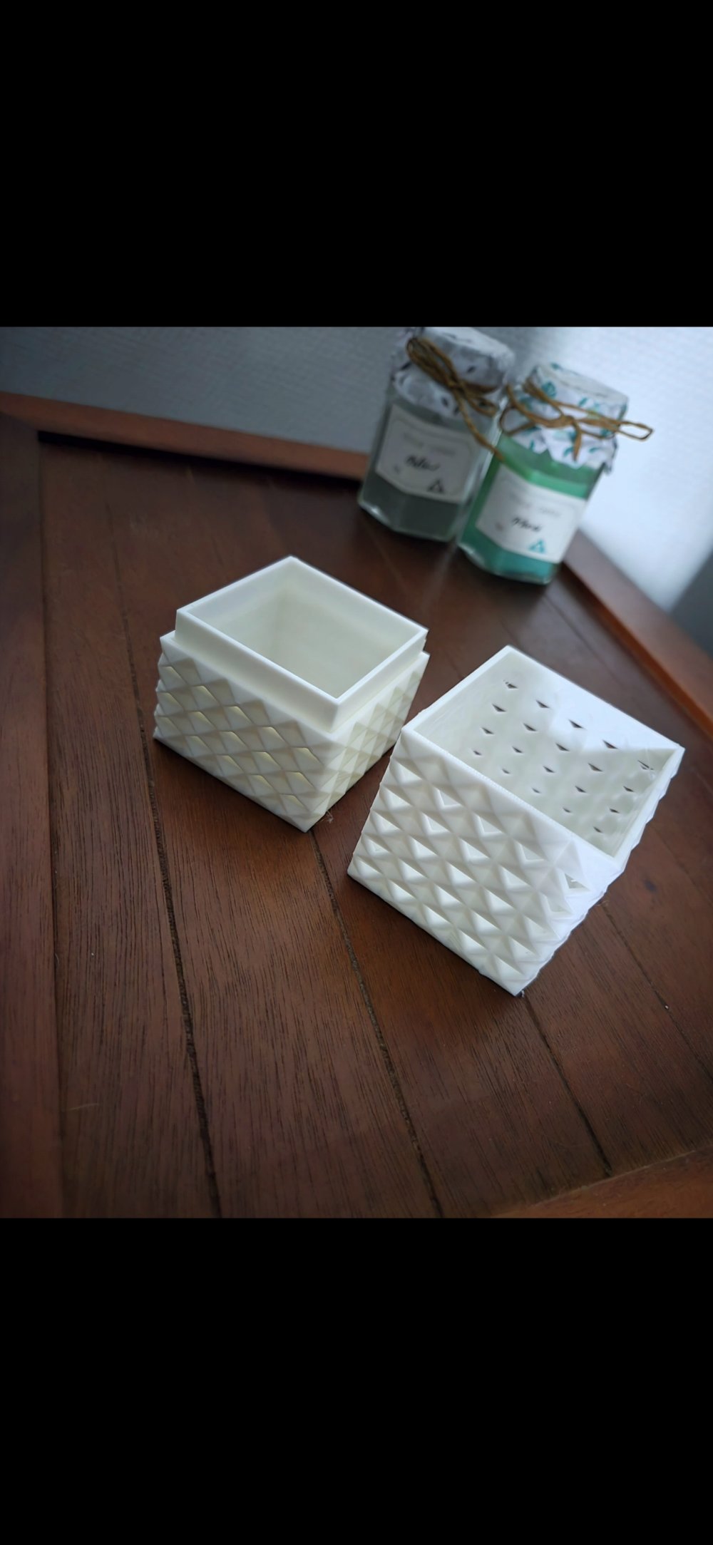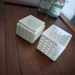 Apportez une touche de modernité et d'élégance à votre coiffeuse avec cette boîte à bijoux au design architectural unique. Entièrement réalisée en impression 3D, elle se distingue par son motif en relief "diamant" qui joue avec la lumière et offre une texture tactile fascinante.