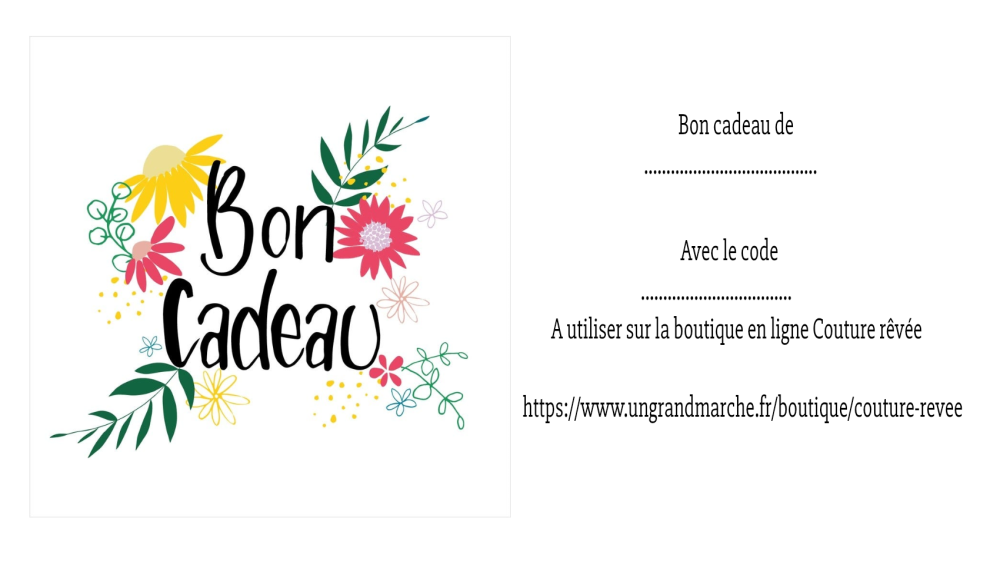 Bon cadeaux d'une valeur de 30€ valable 6 mois, valable sur la boutique en ligne couture rêvée.