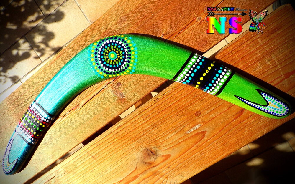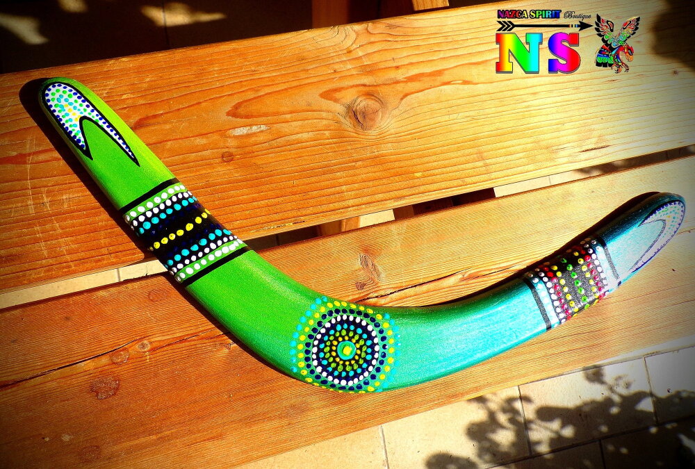 Boomerang en bois 38 cm pour droitier - Création artisanale fait main française - Peinture inspiration aborigène Australie.