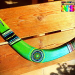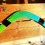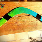 Je vous présente un véritable boomerang en bois de 38 cm de long sur lequel j'ai appliqué des peintures bleu et vert iridescents.
