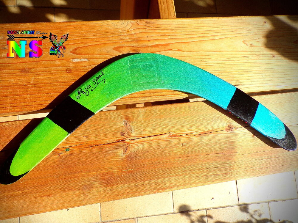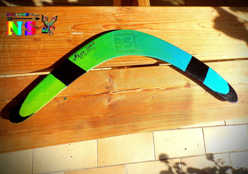 Ce boomerang réalisé entièrement à la main, est un objet destiné à être utilisé en activité plein air (notice d'utilisation jointe au boomerang). Il peut être également utilisé en tant qu'objet d'art décoratif.