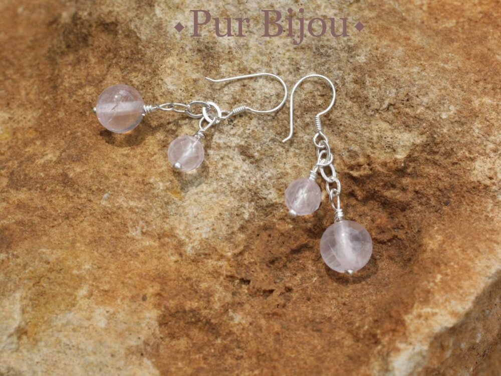 Boucles précieuses composées de perles de Quartz Rose montées sur une chainette en argent