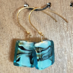 Boucles composées d'une perle bleue rectangulaire. Intérieur blanc, noir et bronze.