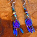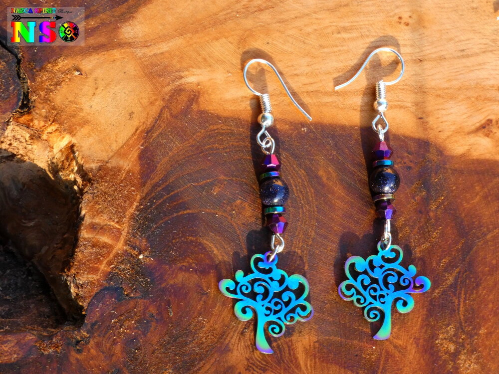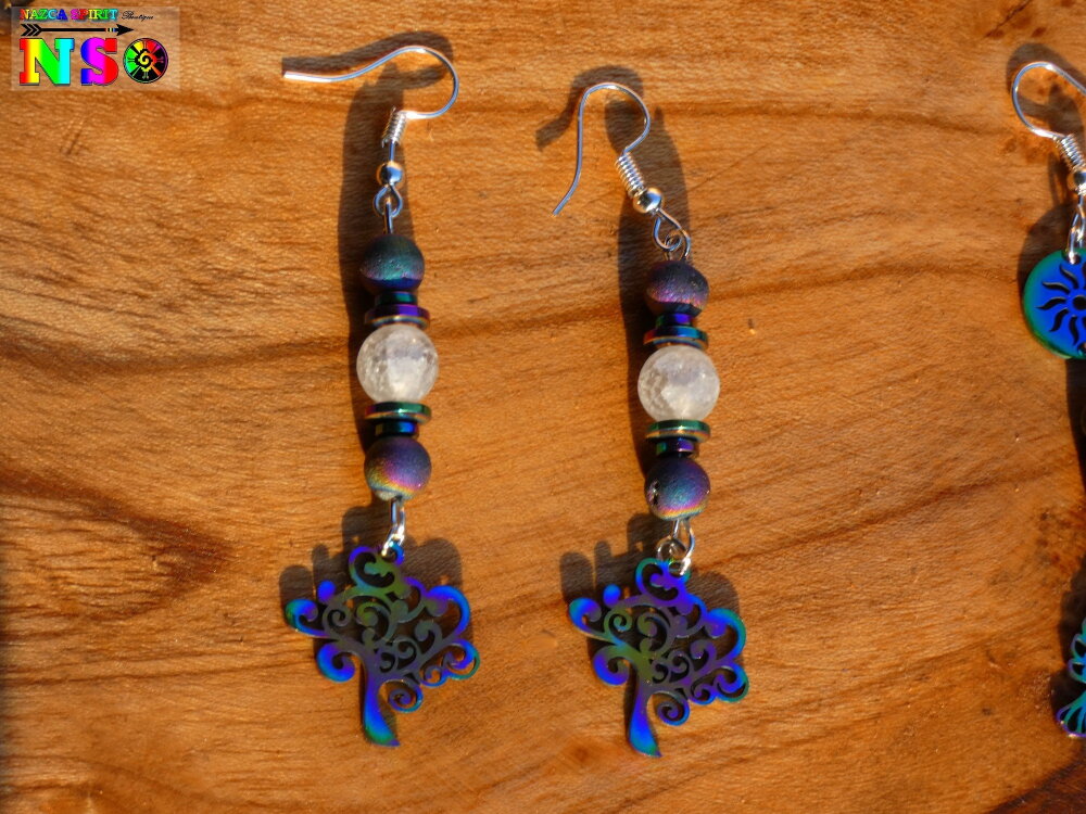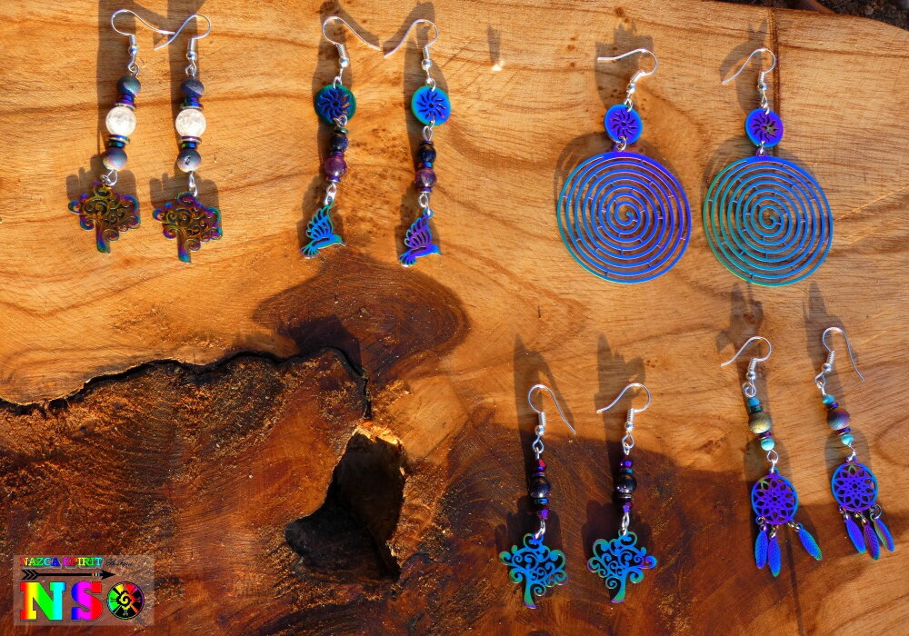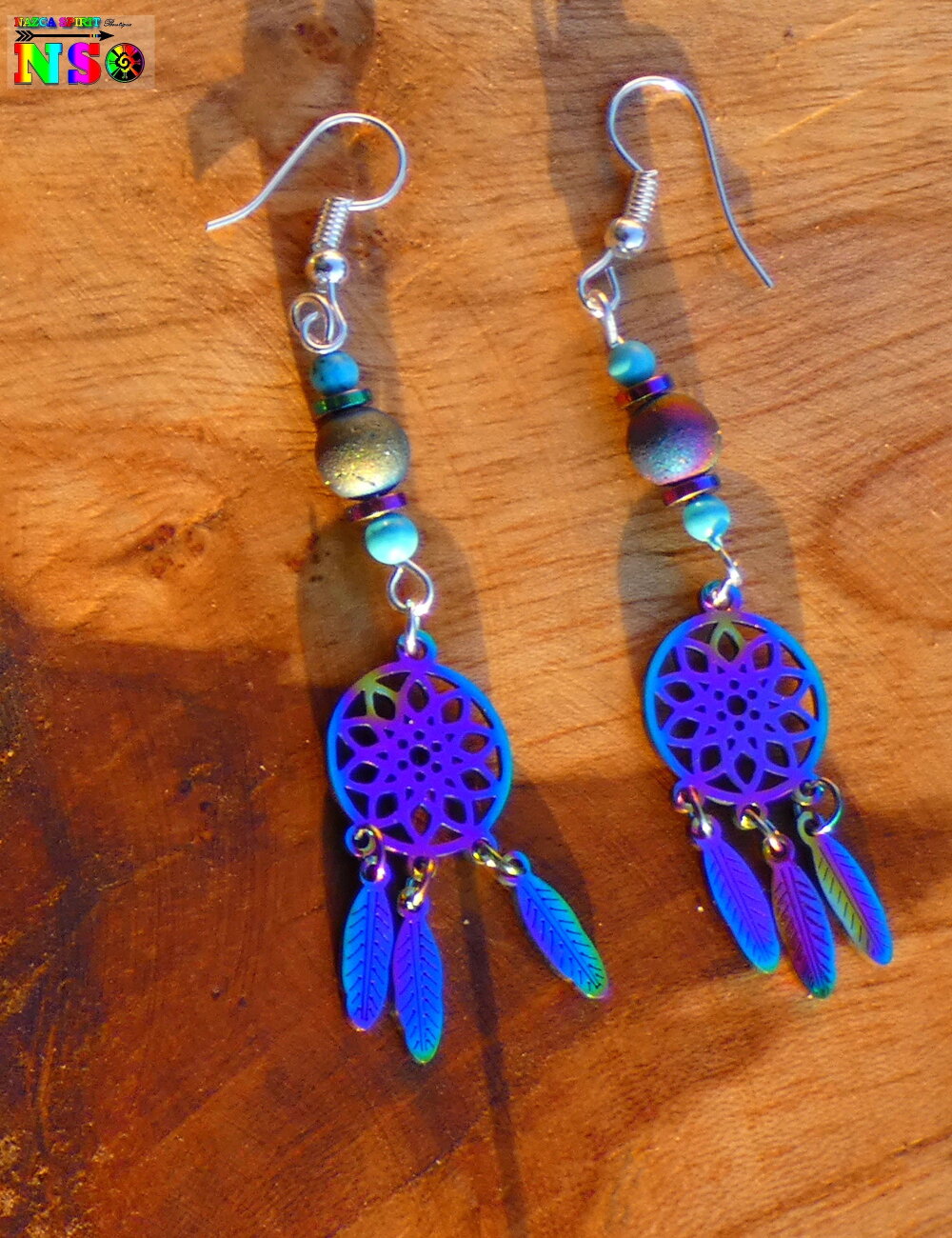 Je vous propose plusieurs modèles de boucles d'oreilles pendantes inspirés des bijoux bohème et ethniques. Ces boucles d'oreilles ont été réalisées à la main à partir de divers connecteurs réalisés dans de l'acier inoxydable ciselé et plaqué au titane pour obtenir ces superbes effets arc-en-ciel iridescent.