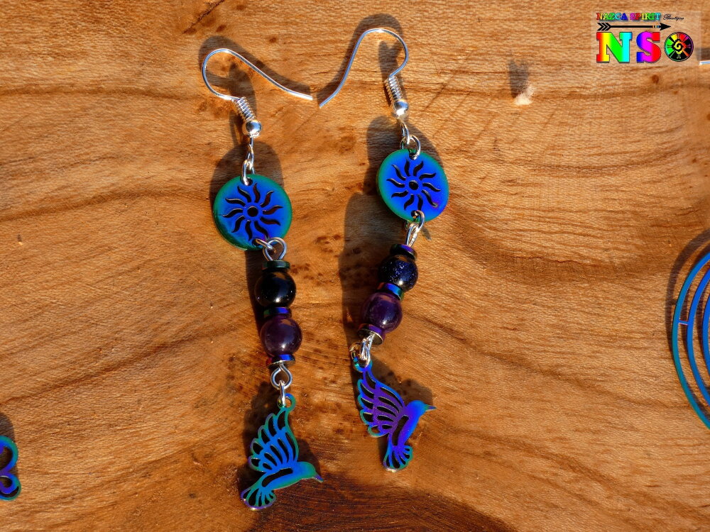 7.5 cm de long (soleil et colibri en acier multicolore, améthyste, pierre du soleil bleu marine)