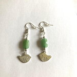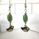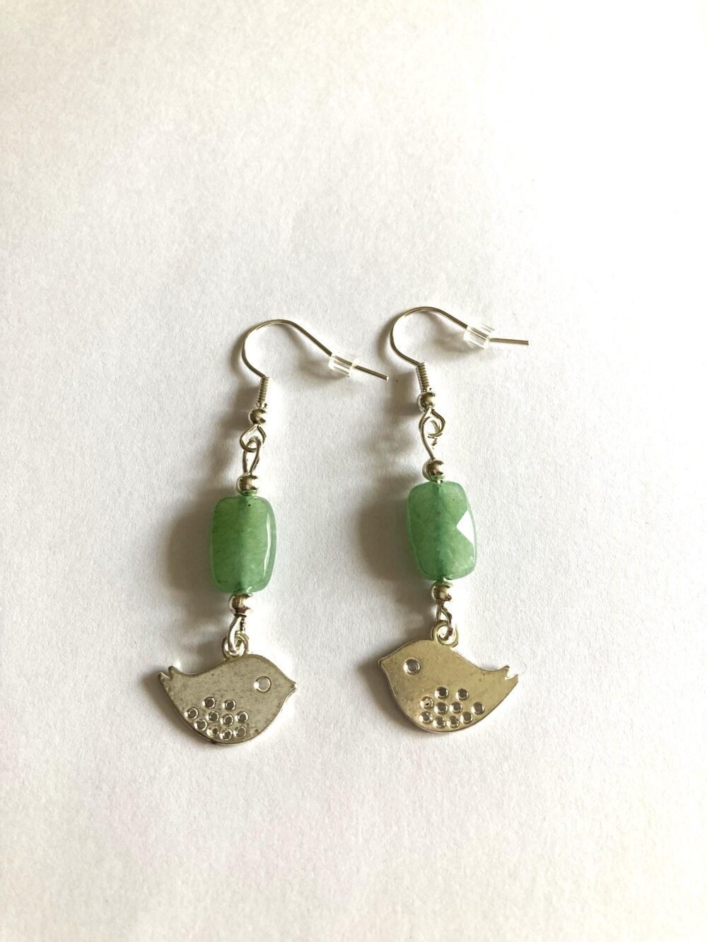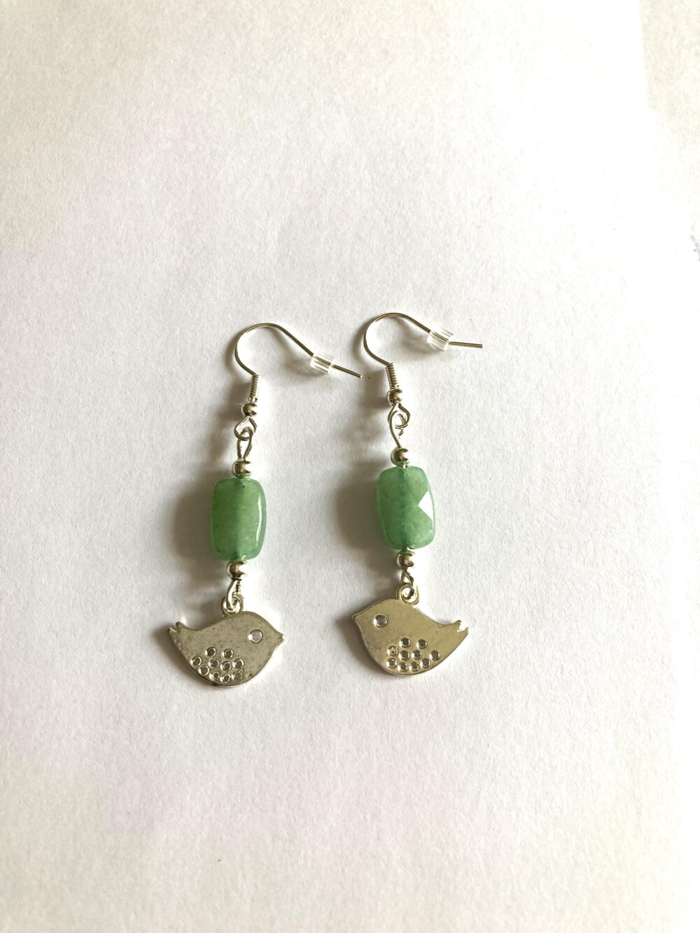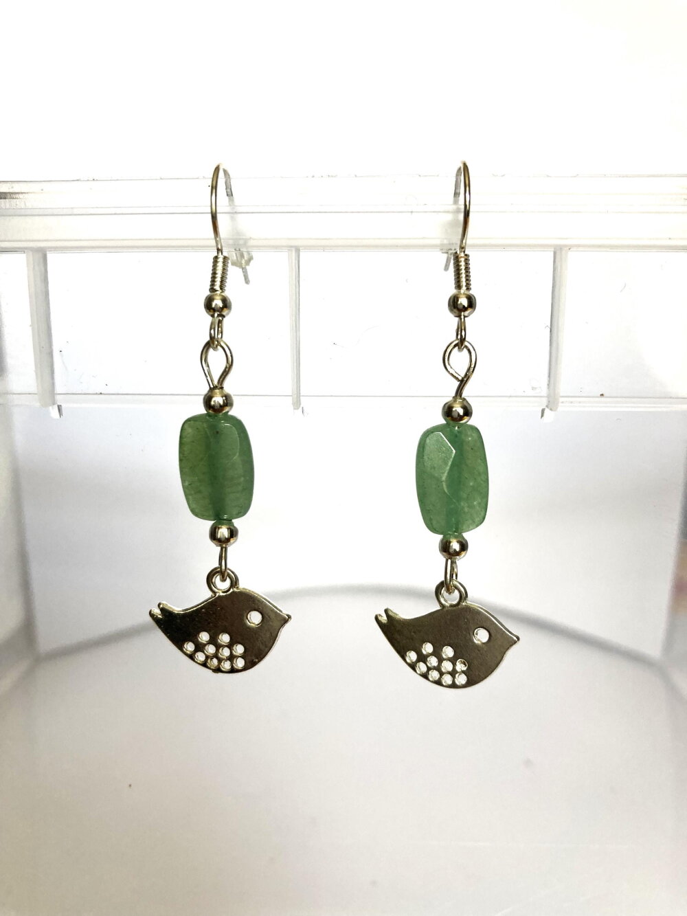 Boucles d'oreilles oiseau argenté et aventurine. Bijou femme.