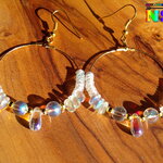 Ces superbes créoles plaqué or aux notes seventies, ont été réalisées à partir de perles de cristal de bohème aurore boréale au doux reflets multicolore iridescents, de perles gouttes en cristal Swarovski aurore boréale et de perles en cristal imitation moonstone. Ces boucles d'oreilles équipées de crochets en laiton plaqué or sont traités hypo allergéniques et mettront en valeur toutes vos tenues ethniques et bohèmes.