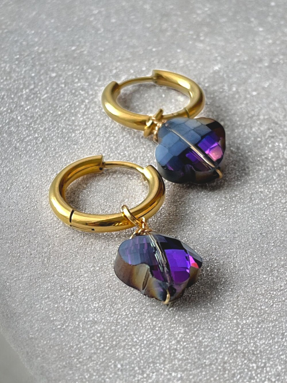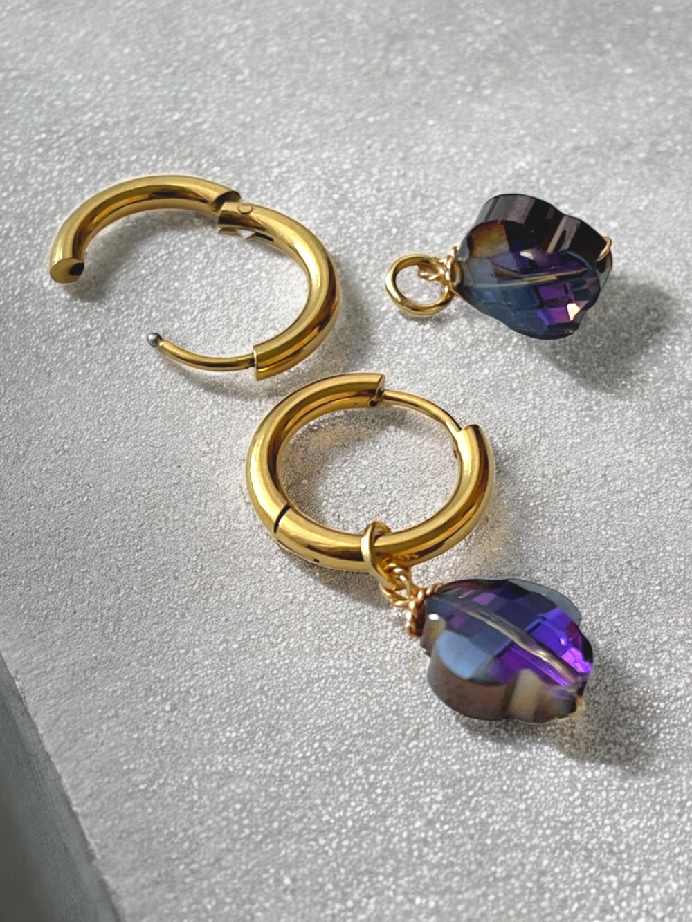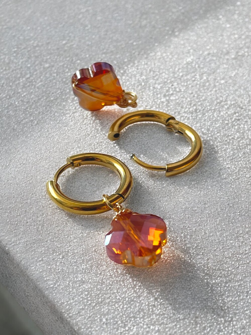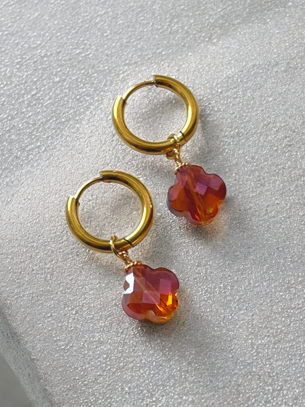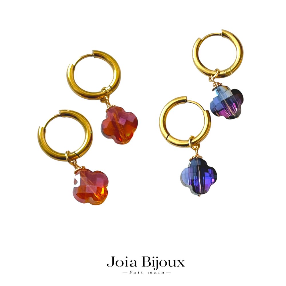 Boucles d’oreilles lumineuses composées d’une pampille trèfle en cristal taillé orange ou violet, suspendue à une créole dorée en acier inoxydable. Un bijou artisanal éclatant et élégant, parfait pour illuminer vos tenues.