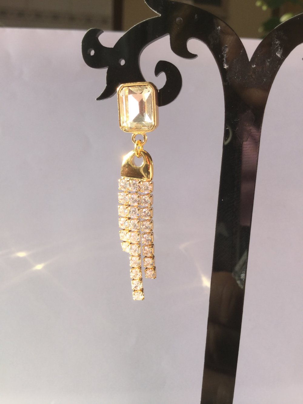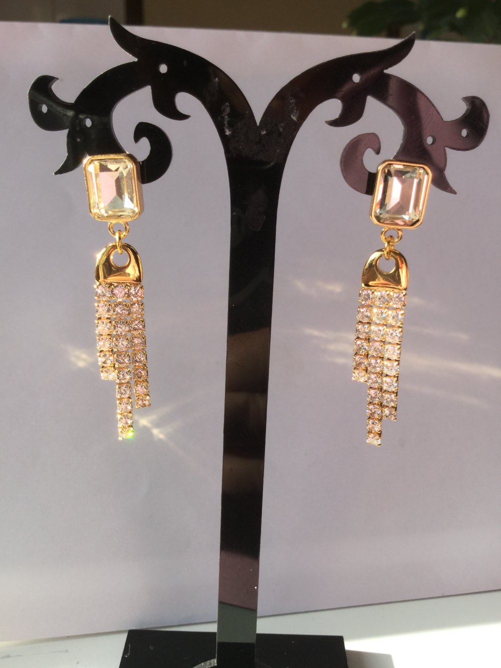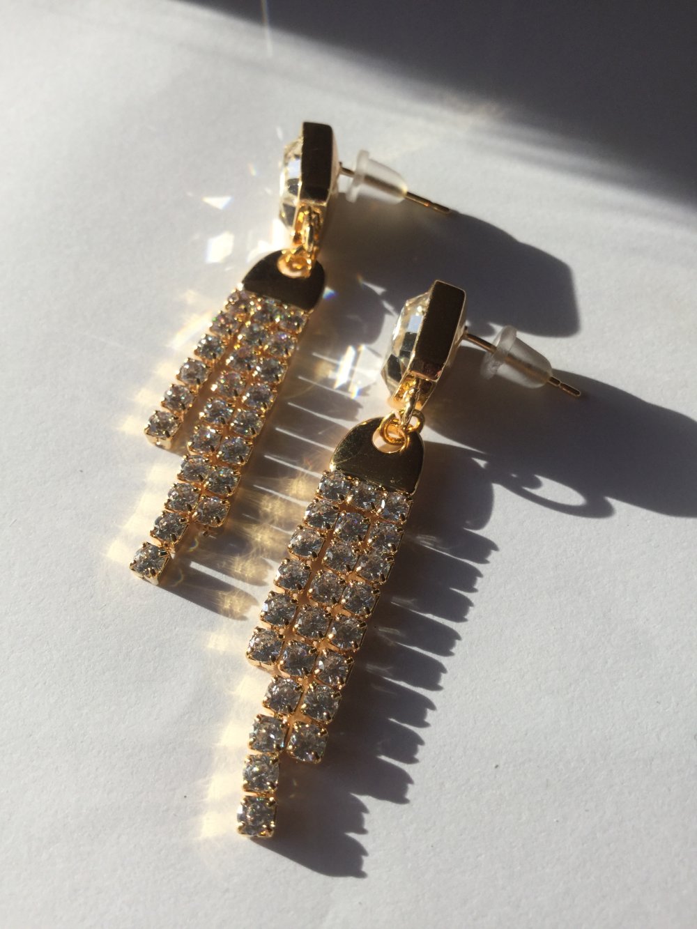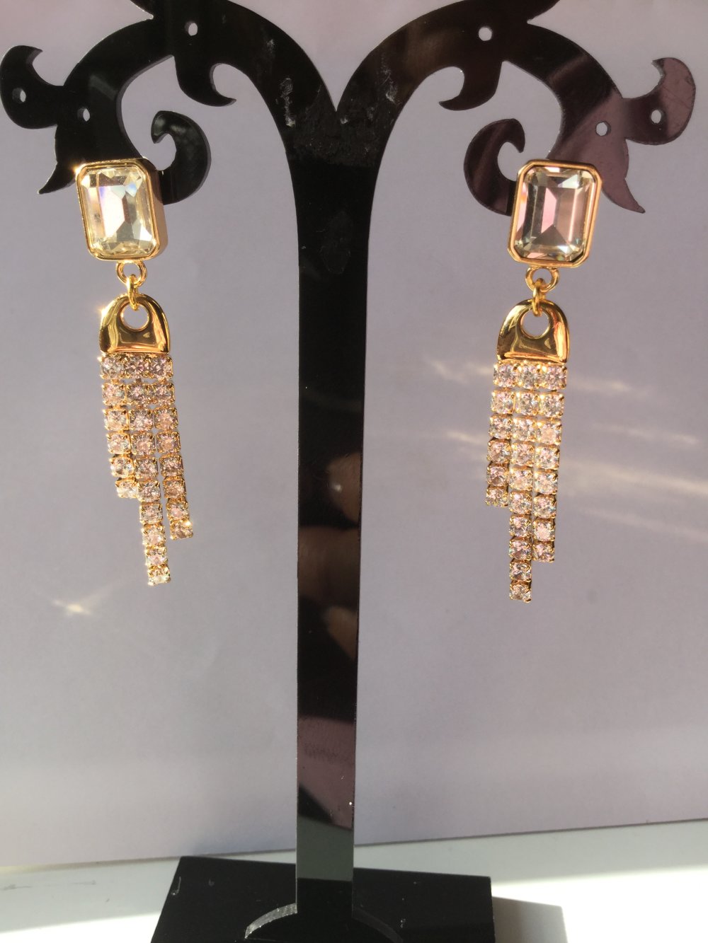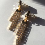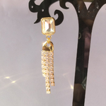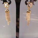Boucles d'oreilles, hyper légères, idéales pour de belles tenues de fêtes, composées d'un clou d'oreille rectangulaire de 10x8 mm doré à l'or fin, orné d'un strass cristal transparent biseauté sous lequel se balance une frange de strass de 36x8 mm dorée à l'or fin également et couverte de strass carrés sertis.