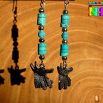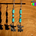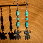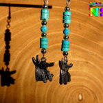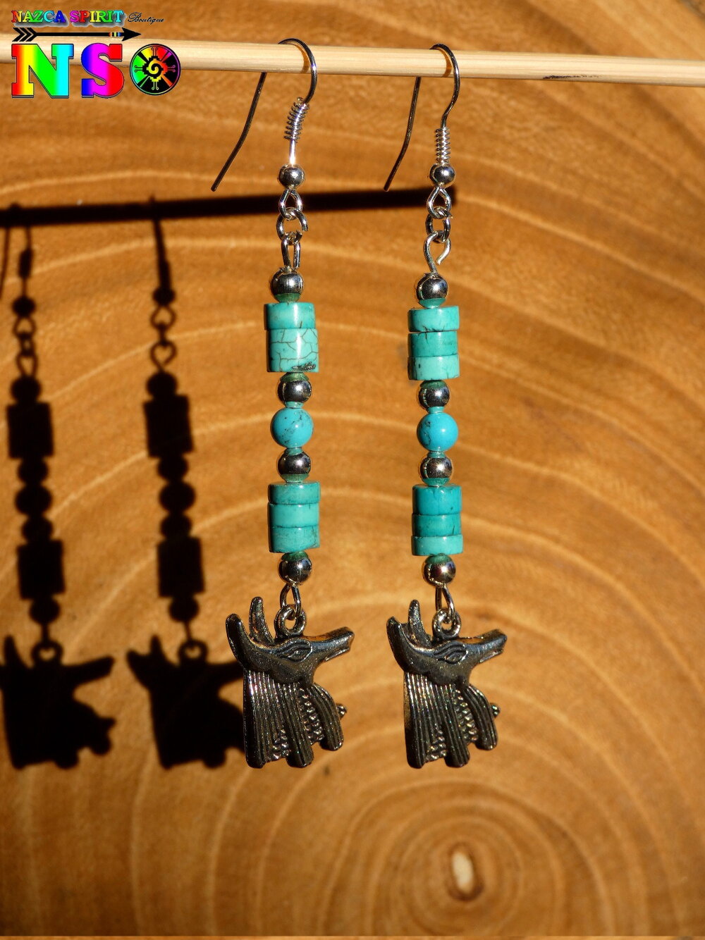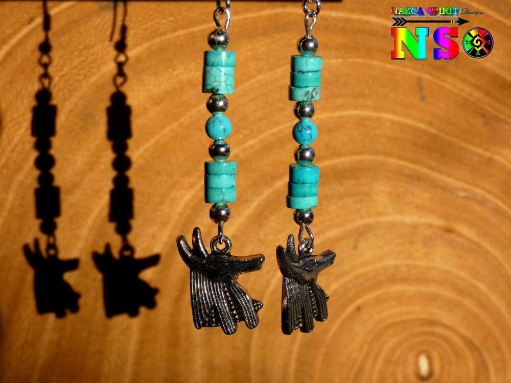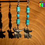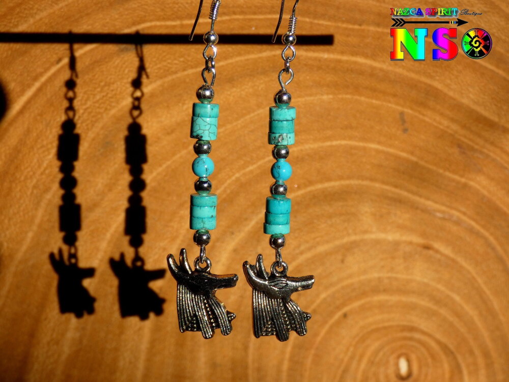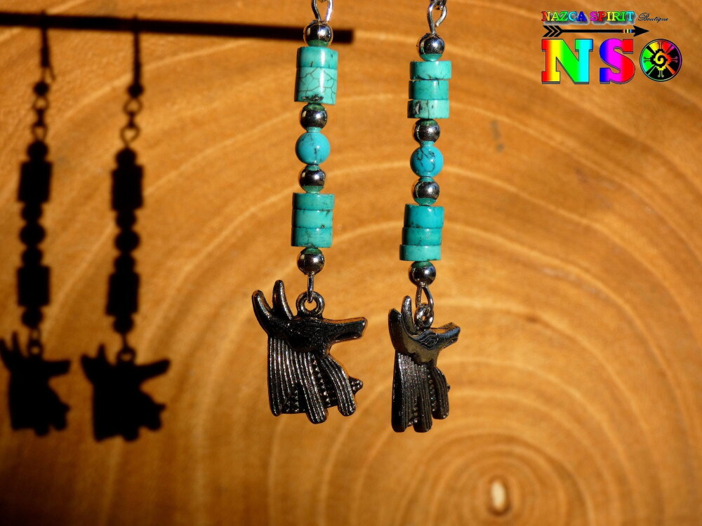 Passionnée par l'Egypte antique, et plus particulièrement par les bijoux de l'époque, j'ai voulu créer une paire de pendants dans un pure esprit égyptien. C'est pourquoi j'ai choisi d'utiliser des pendants représentant le dieu Anubis pour réaliser cette sublime paire de pendants d'oreilles et de les associer à des perles en véritables turquoises naturelles (Origine : USA). Les pendants sont équipés de crochets en cuivre plaqué argent.