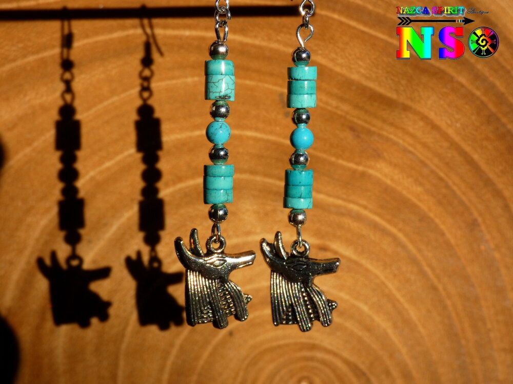 Je vous propose de découvrir une superbe paire de pendants d'oreilles faits main inspirés des bijoux de l'Egypte antique. Ces pendants pour oreilles percées, ont été réalisés à partir de crochets en cuivre plaqué argent, de pendants représentant le dieu Anubis, de petites perles en cuivre plaqué argent et de perles tubes et rondes en turquoise naturelle bleue.