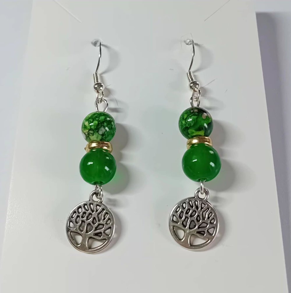 Boucles d'oreilles en acier inoxydable orné de ses perles en verre verte 8 mm Breloques arbre de vie