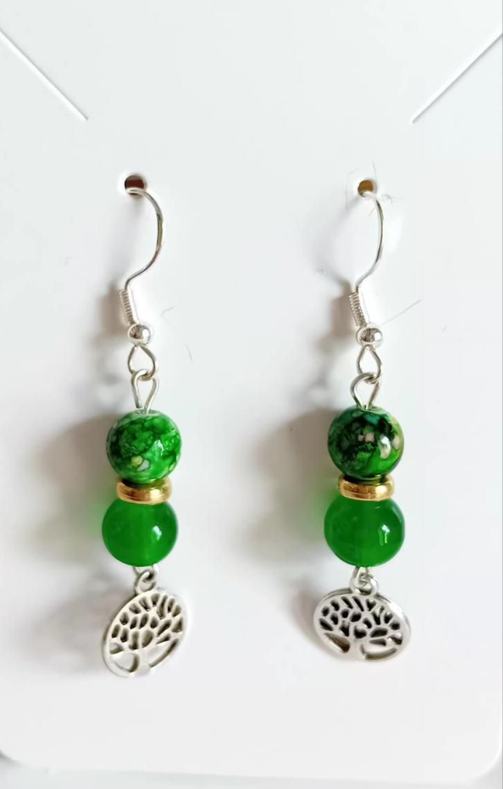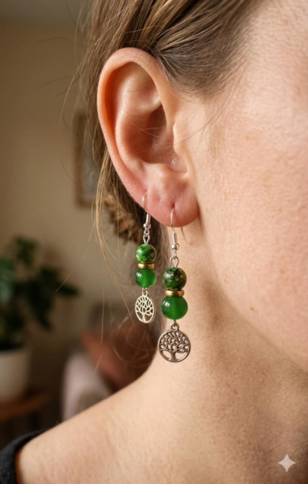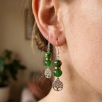 Apportez une touche de fraîcheur et de symbolisme à votre style avec ces élégantes boucles d’oreilles artisanales. Composées de perles vertes lumineuses et d’un charm délicat représentant l’arbre de vie, elles incarnent l’harmonie, la croissance et l’énergie naturelle.