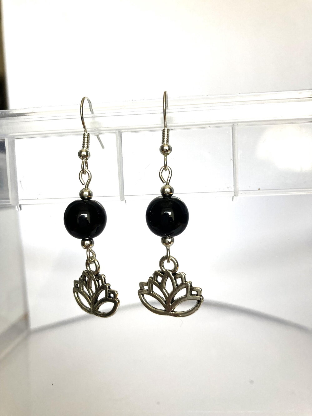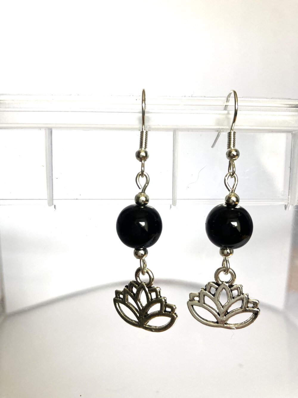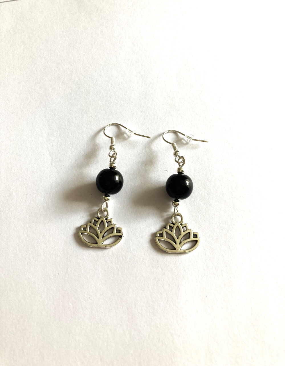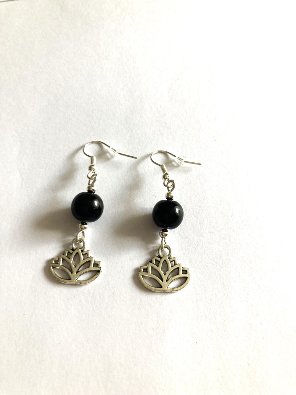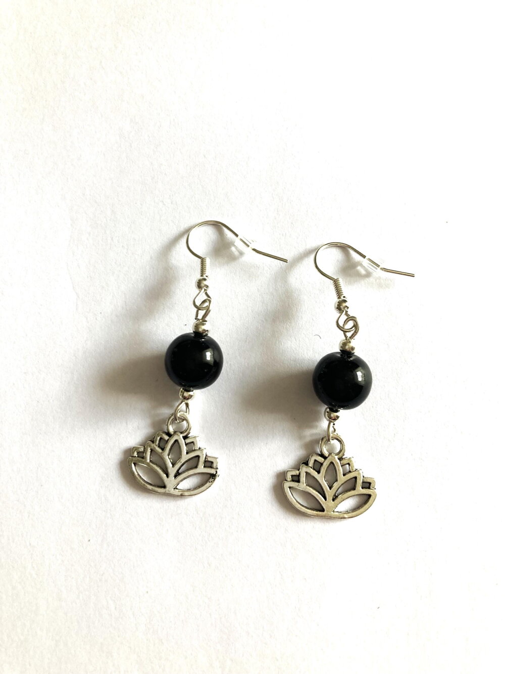 Boucles d'oreilles fleur de lotus argentée et onyx noir perle ronde. Bijou femme.
