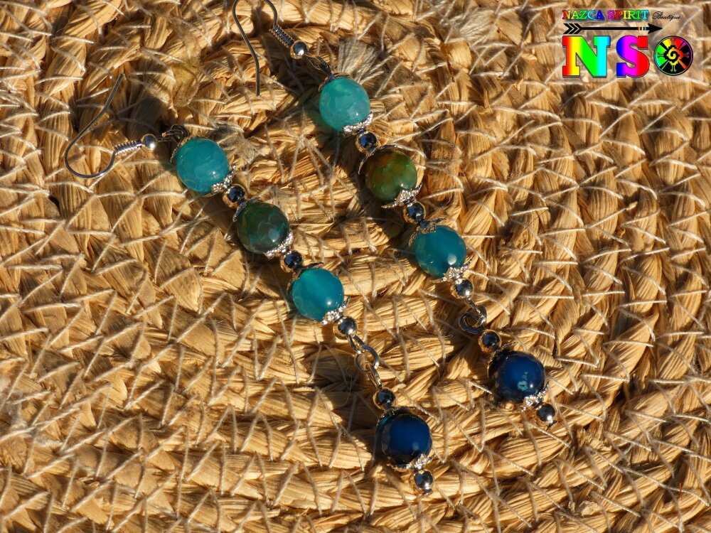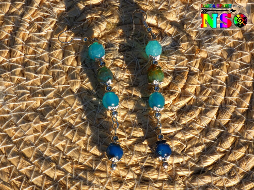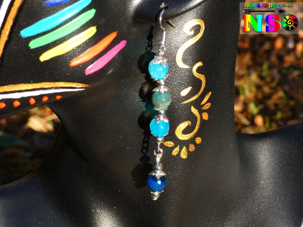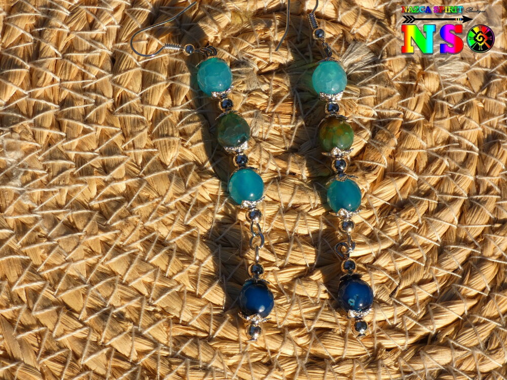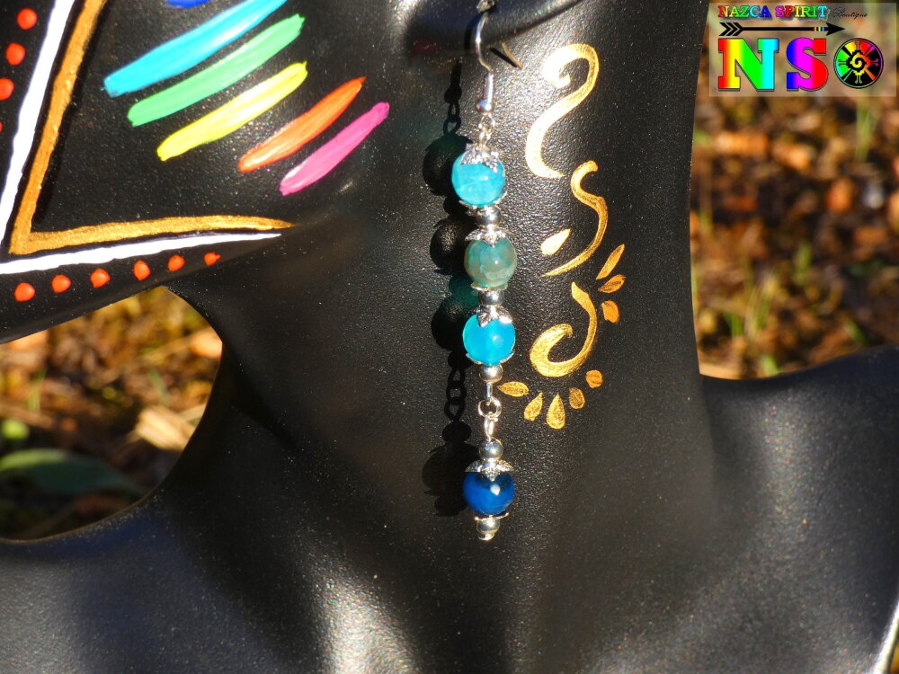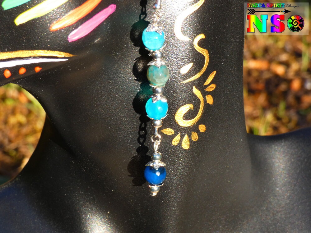 Boucles d'oreilles Pendants Bohème hippie - Bijou pour femme - Création artisanale - Agates Veine de Dragon Bleu Turquoise et Bleu Cobalt