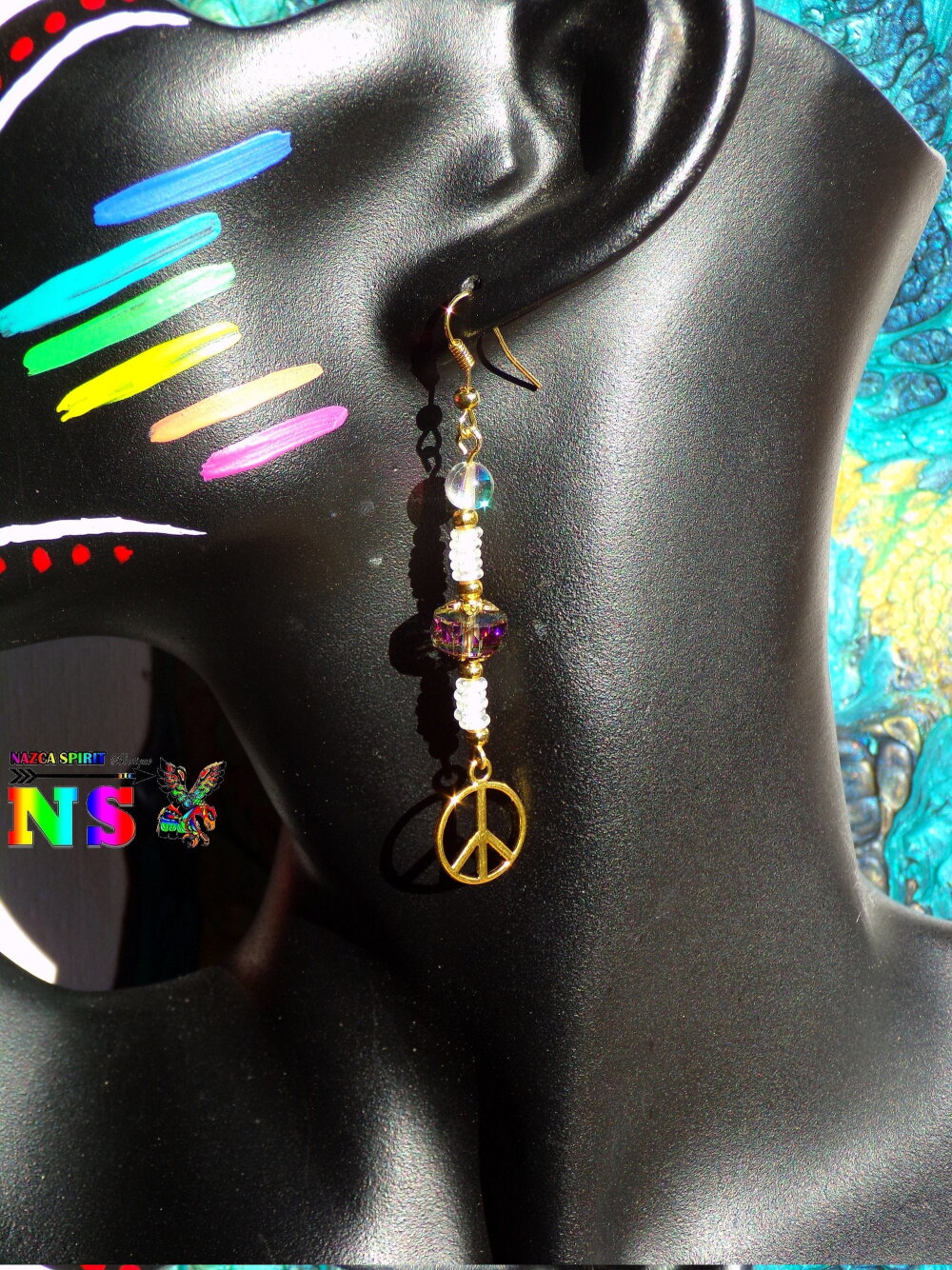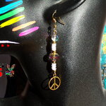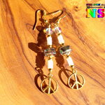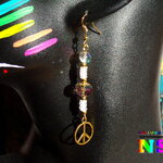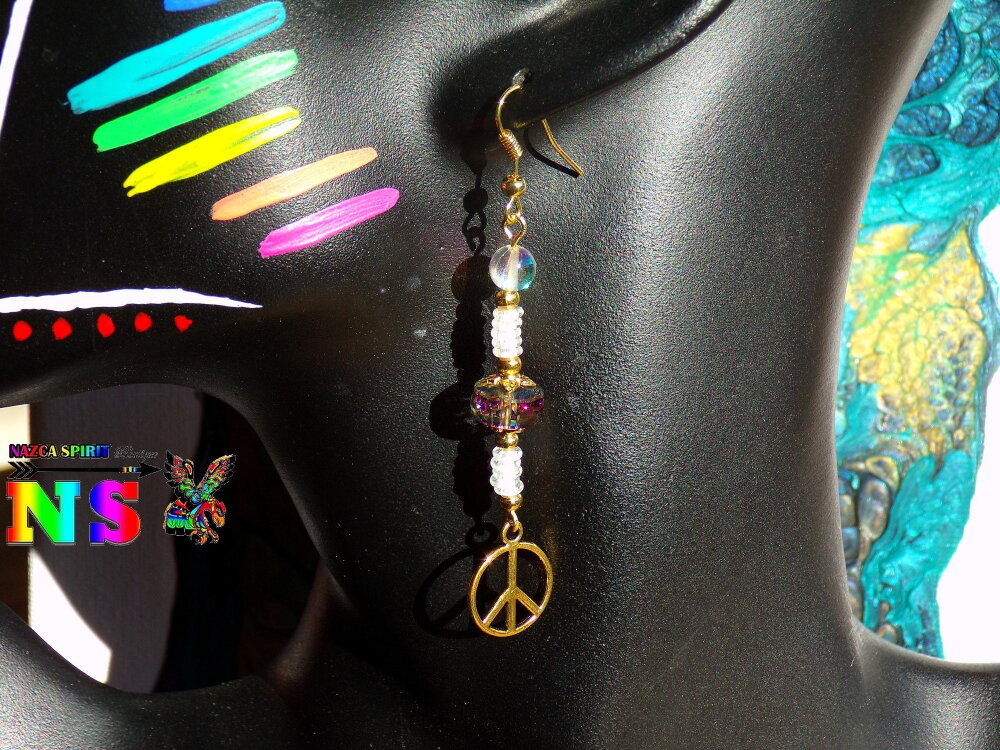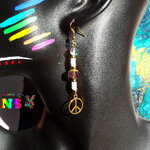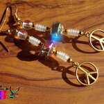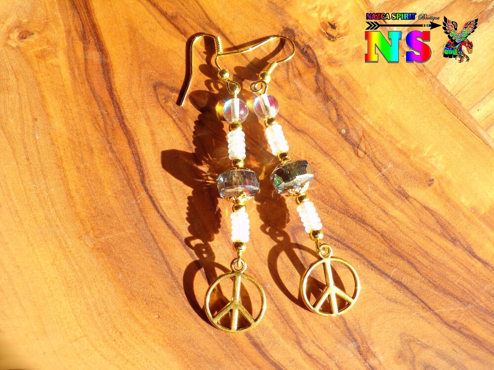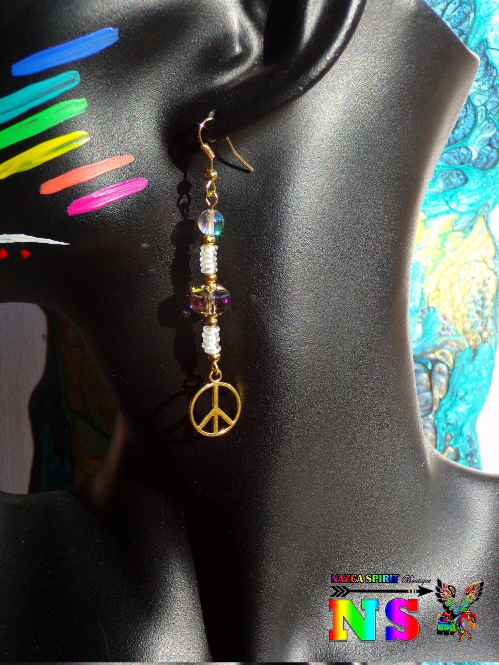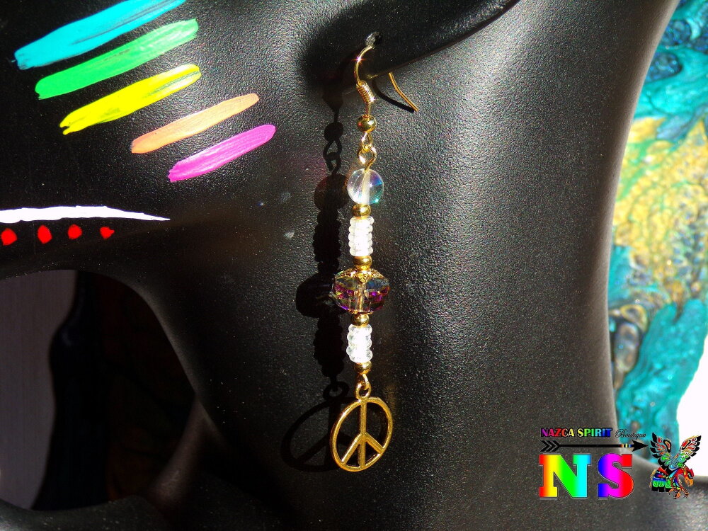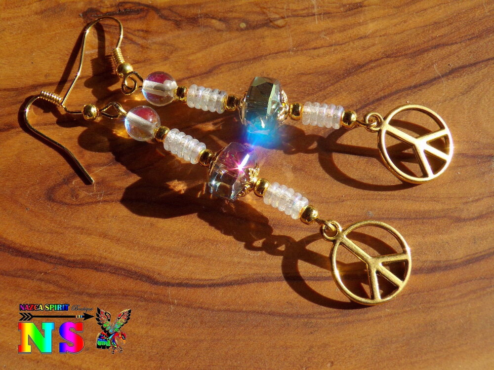Ces superbes pendants plaqué or aux notes hippie, ont été réalisées à partir de perles de cristal de bohème aurore boréale au doux reflets multicolore iridescents. Ces boucles d'oreilles équipées de crochets en laiton plaqué or sont traités hypo allergéniques et mettront en valeur toutes vos tenues ethniques et bohèmes. Au bout des pendants, j'ai relié des symboles peace & love en laiton plaqué or.