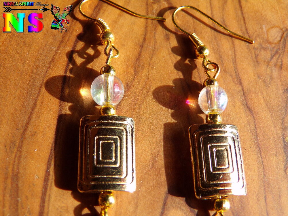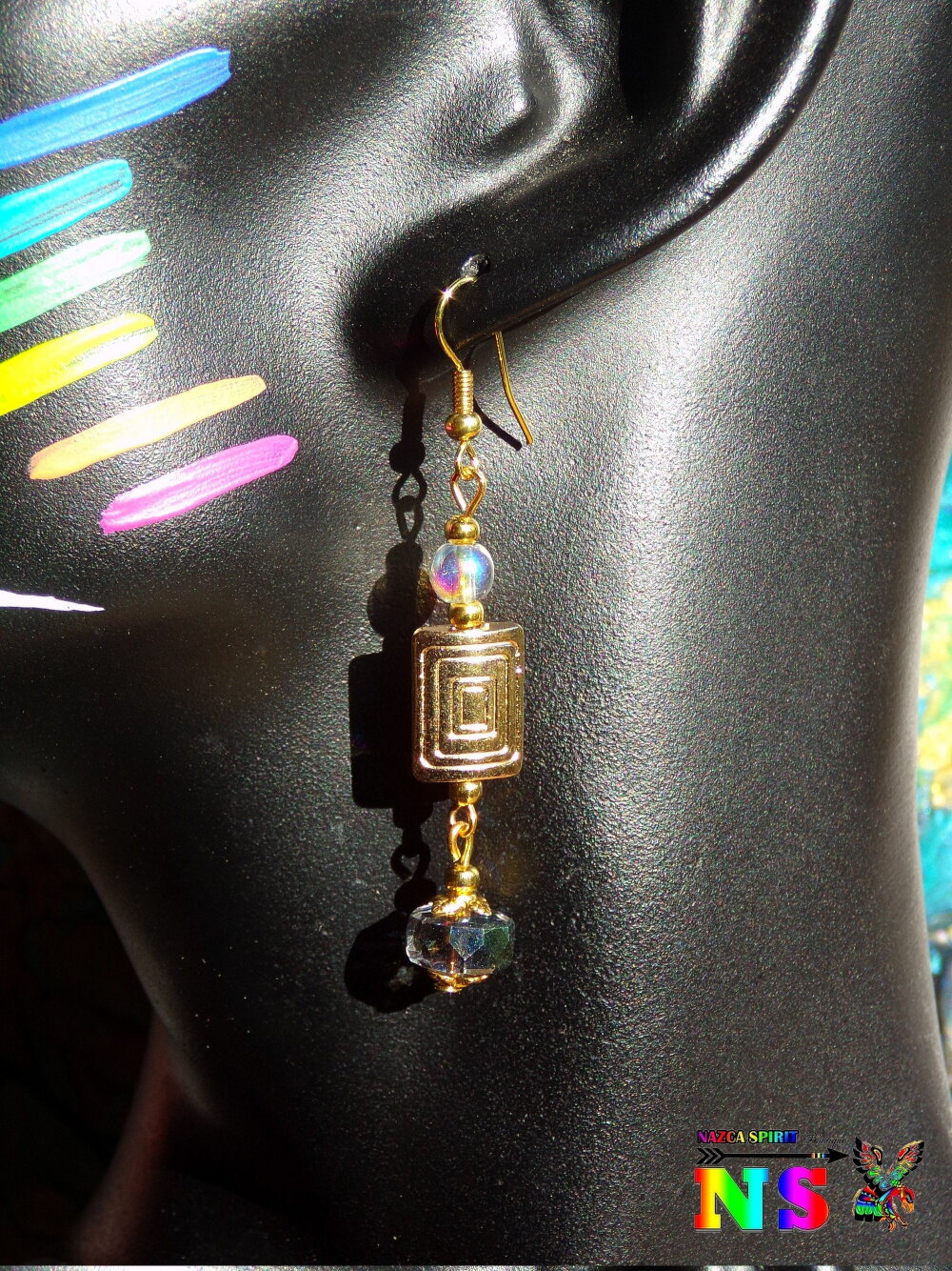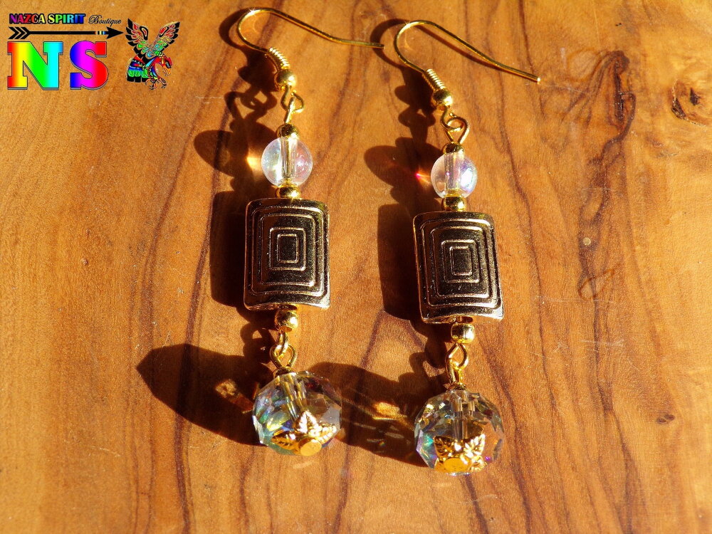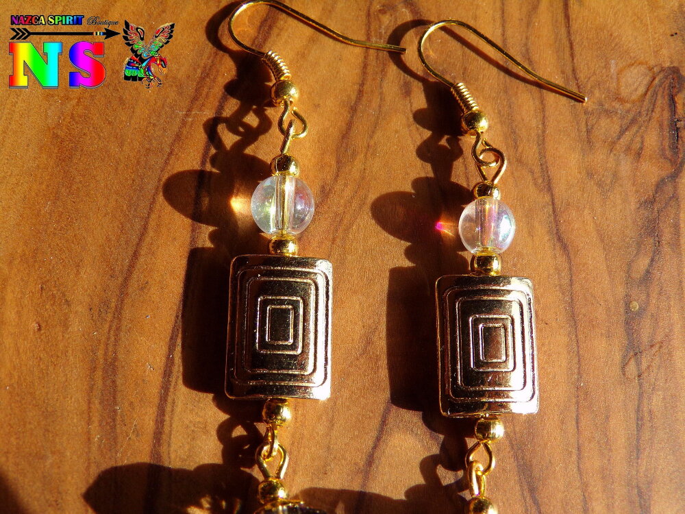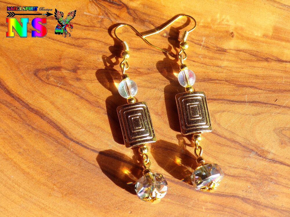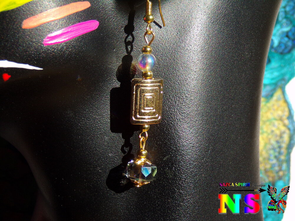Boucles d'oreilles Pendants Bohème hippie en Laiton Plaqué Or - Bijou pour femme - Création artisanale - Perles cristal bohème aurore boréale