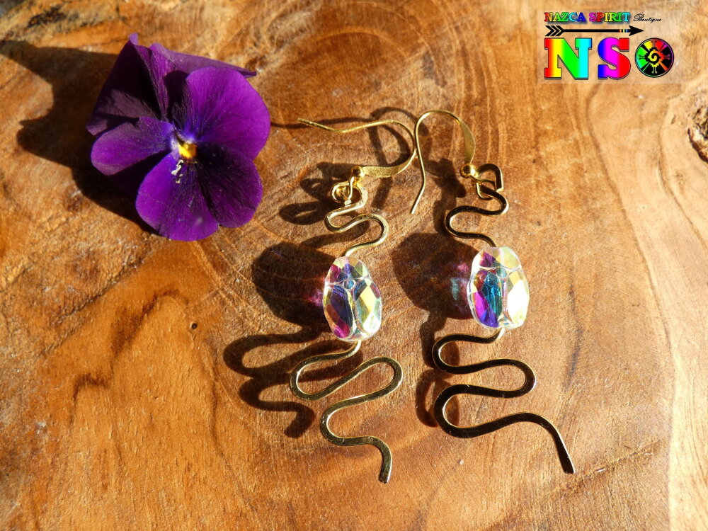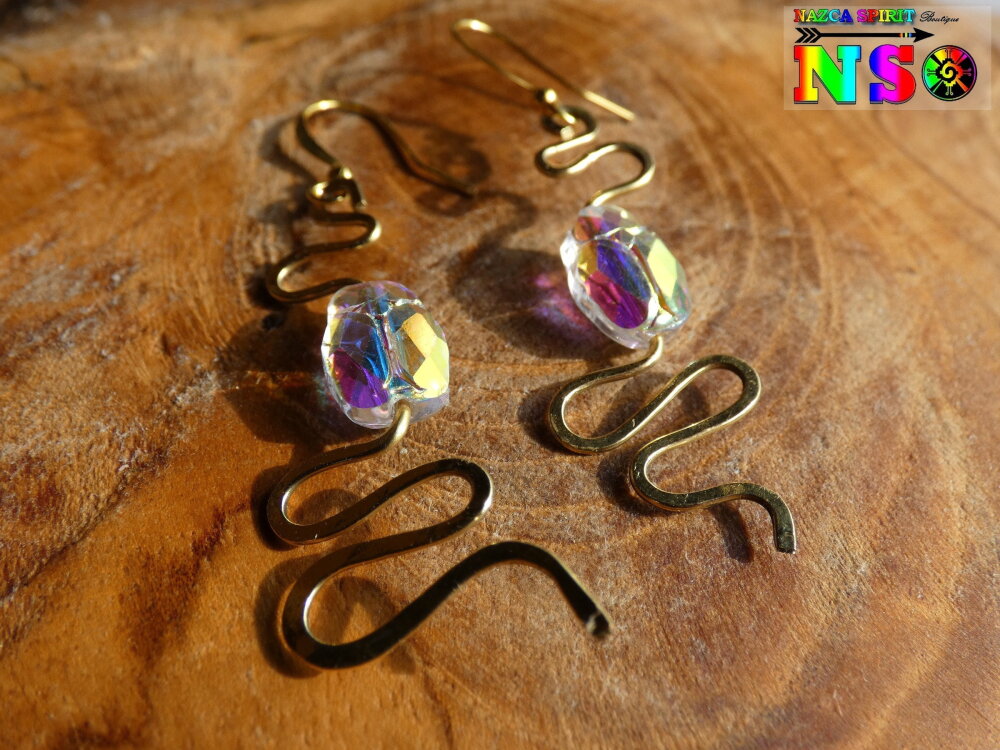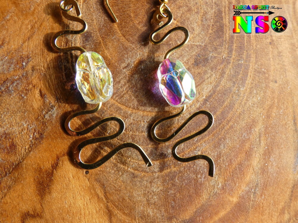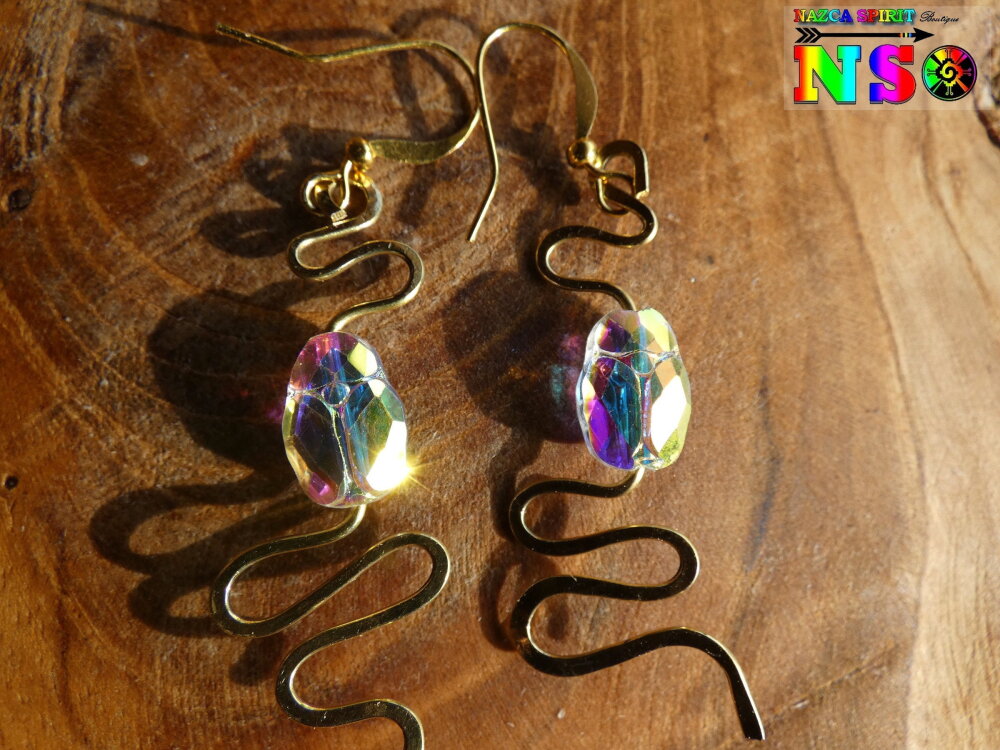 Boucles d'Oreilles Pendants Egyptiens Serpents Laiton Or, Scarabées Cristal Aurore Boréale, Bijou Idée Cadeau Femme Or Brillant Iridescent