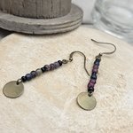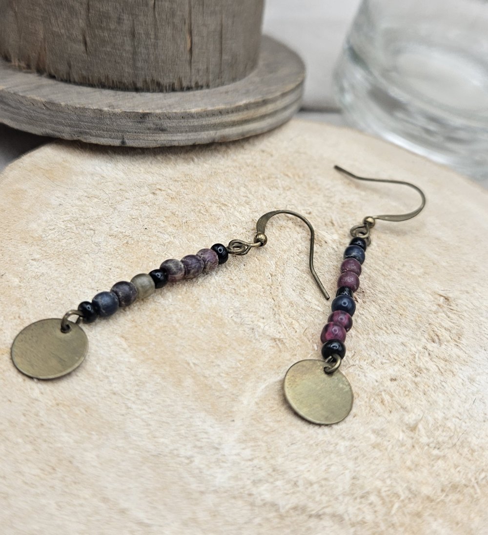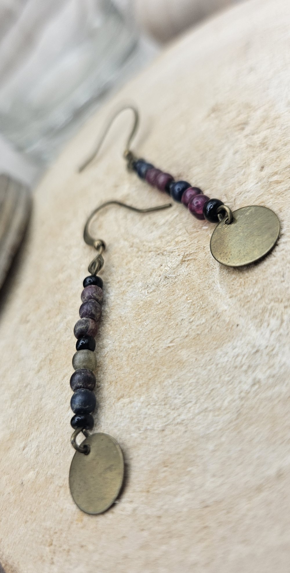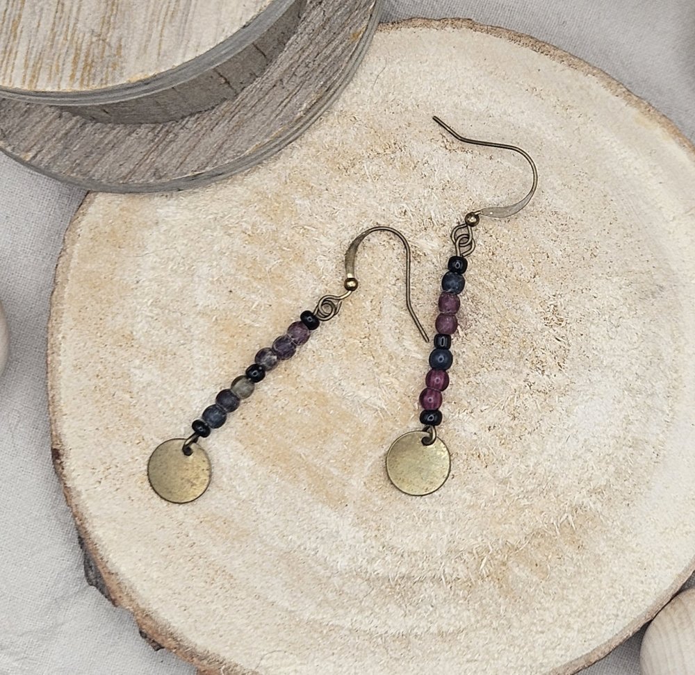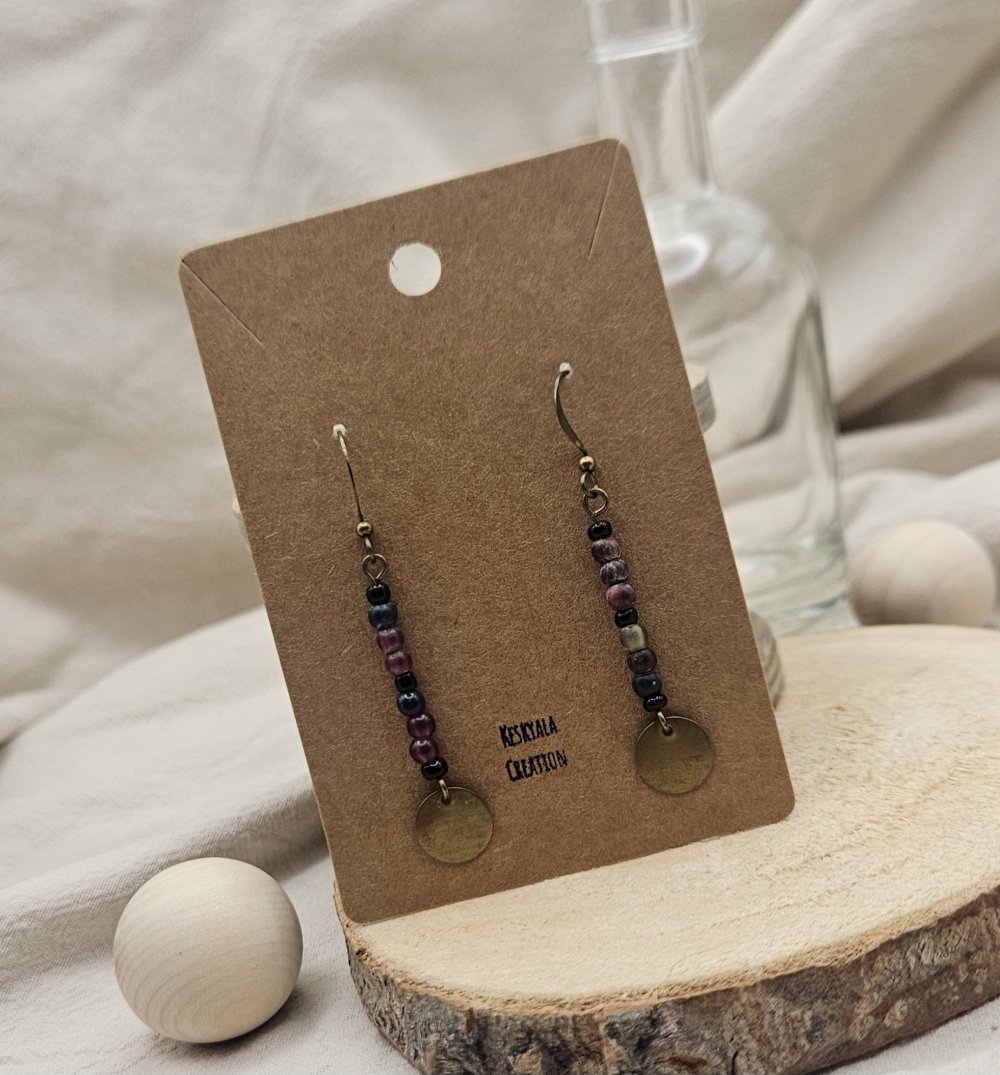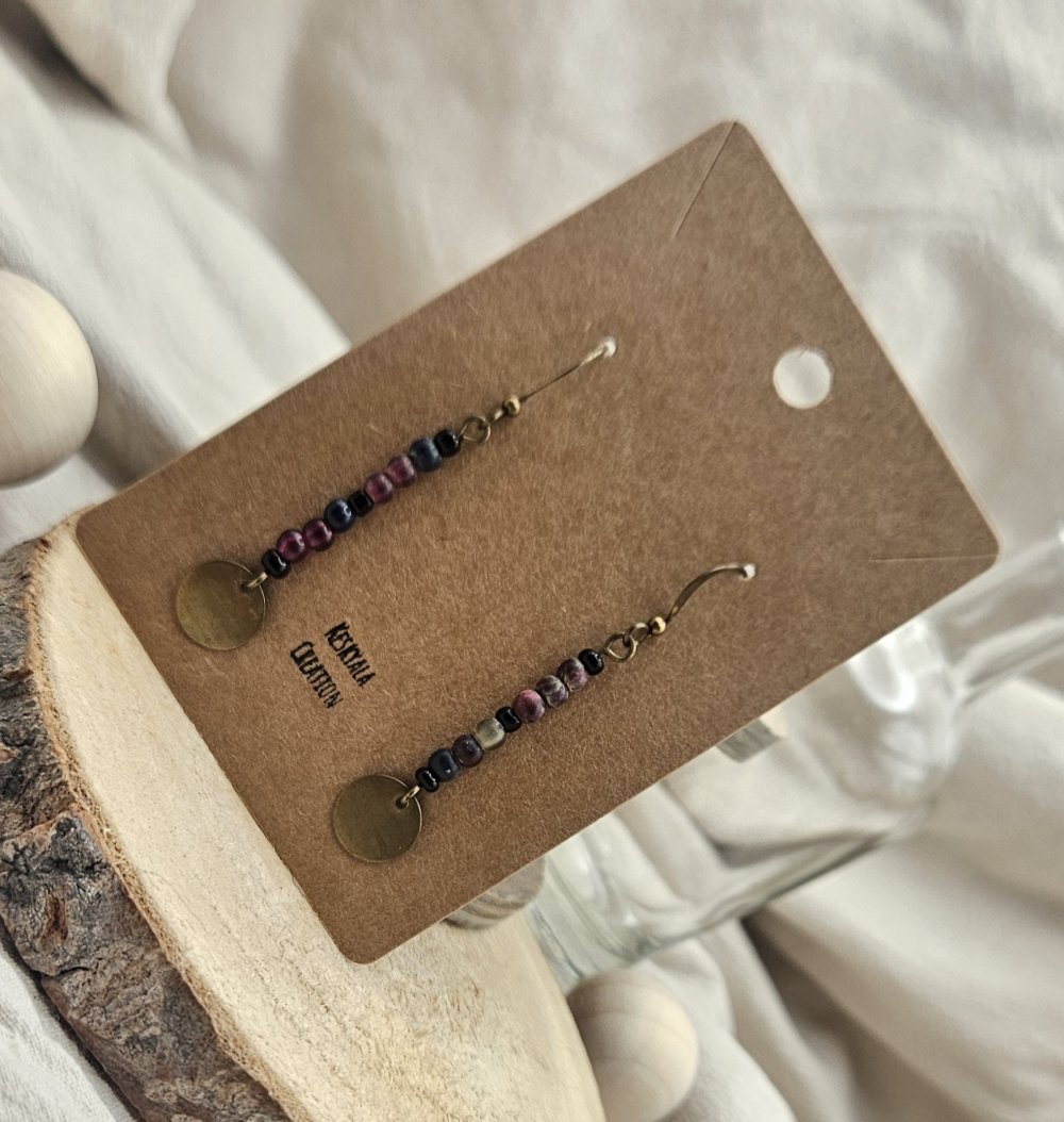 Chaque paire raconte une histoire : des matériaux ayant déjà vécu trouvent ici une nouvelle vie, pour donner naissance à des boucles uniques, au charme discret et authentique. Les nuances de perles, associées à une breloque ronde en finition laiton, offrent un bijou facile à porter au quotidien, tout en conservant une vraie singularité.